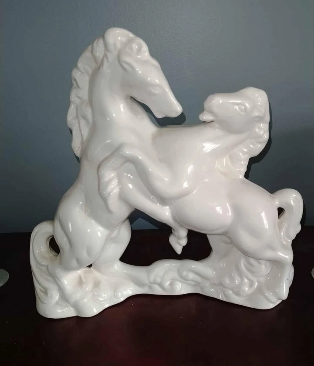 12Unique ceramic sculpture of two horses. Off-white glaze. Mid-century modern style. Decorative accent piece.