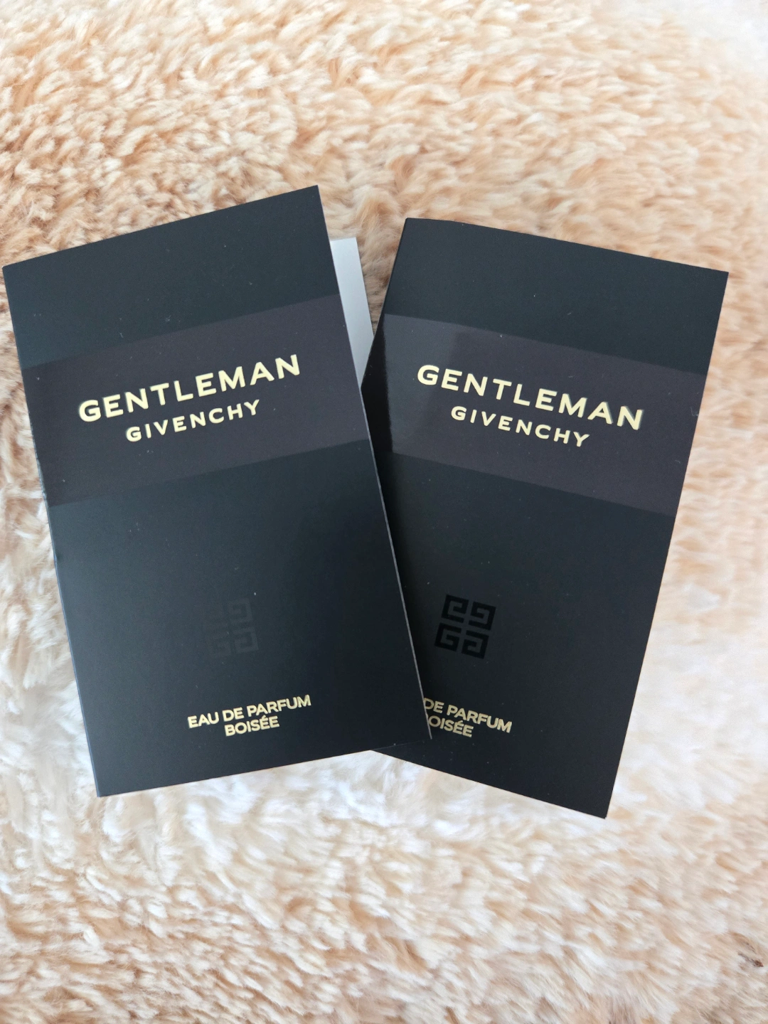 Two Givenchy Gentleman Eau de Parfum Boisee samples. Black card packaging. Eau de Parfum.