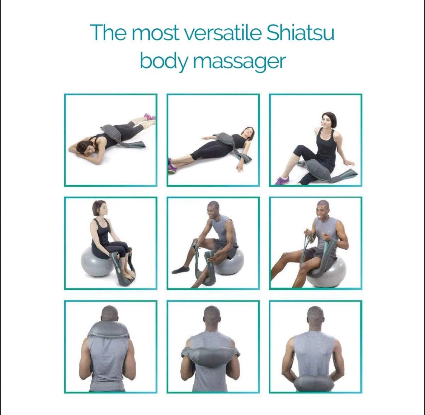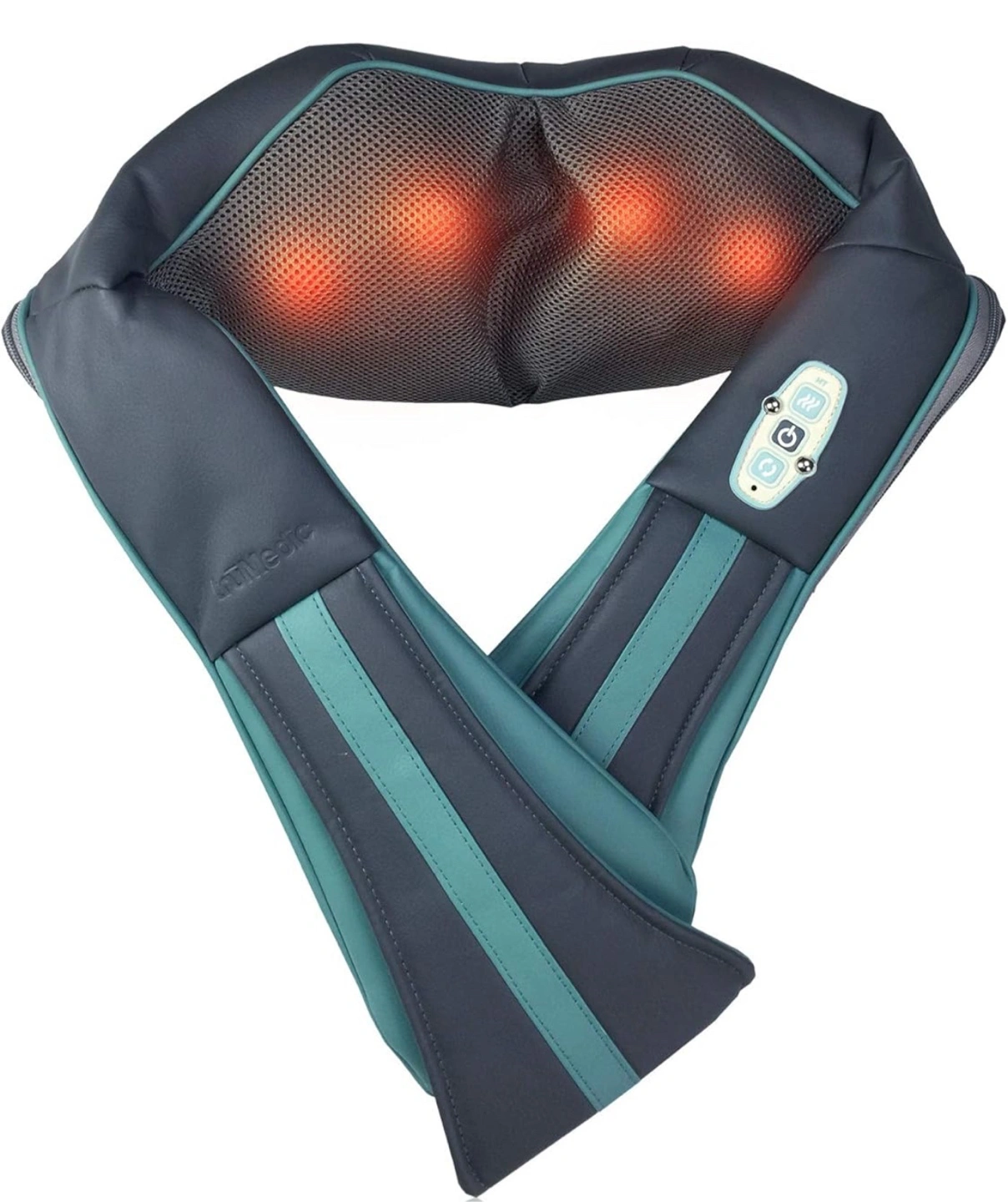 Cordless and rechargeable shiatsu massage device. Features heat function. Easy-to-use control panel. Great for neck and shoulder pain relief.