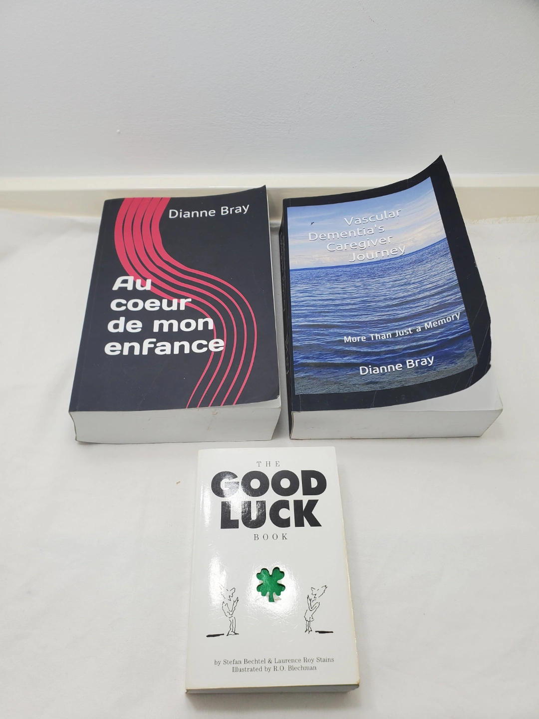 Collection of three used books. Includes two books by Dianne Bray: Au coeur de mon enfance and Vascular Dementia's Caregiver Journey. Also includes The Good Luck Book by Stefan Bechtel & Laurence Roy Stains. Shows some wear.