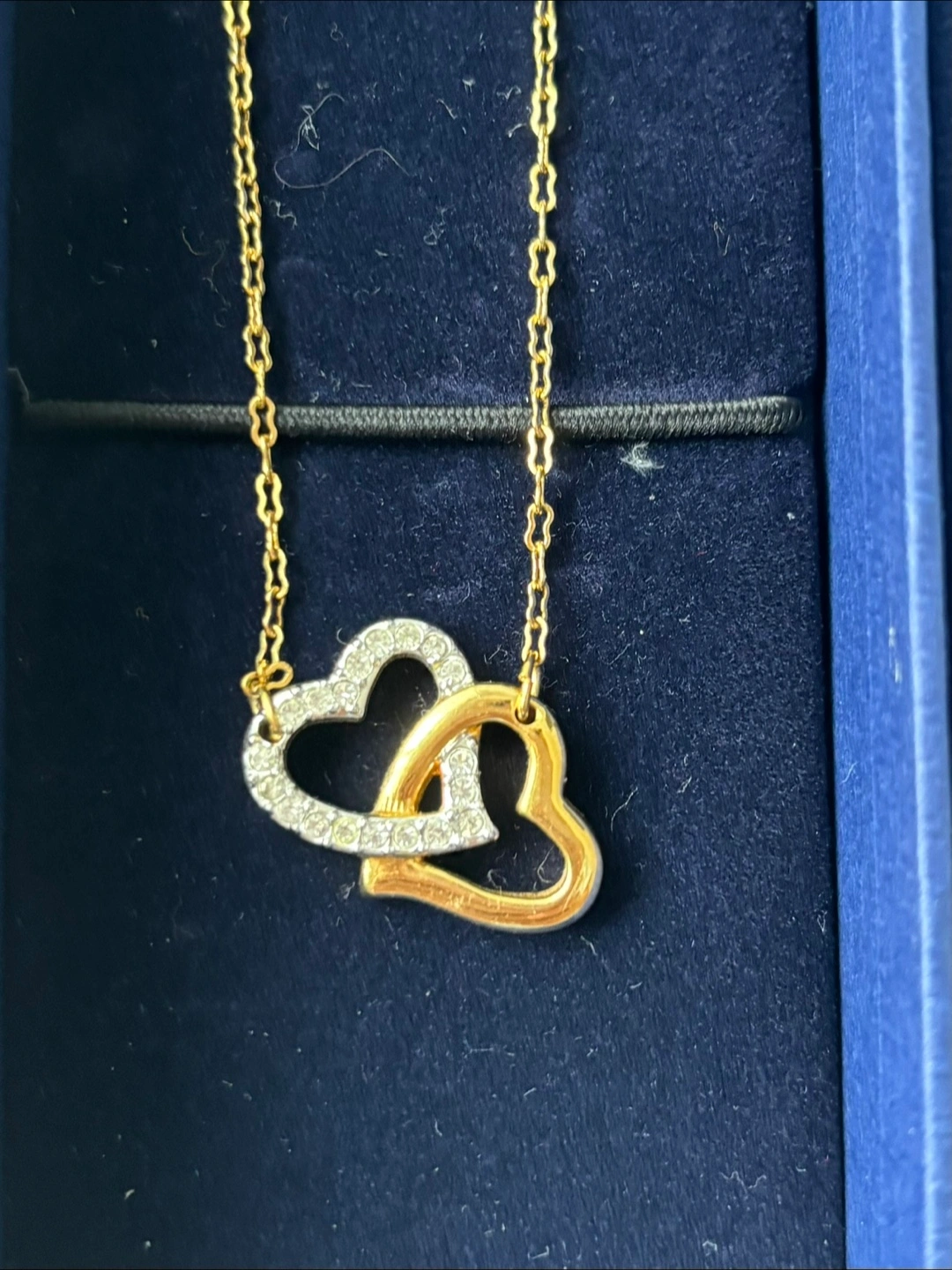 136Gorgeous gold-tone necklace. Features interlocking hearts. One heart features clear crystals. Feel free to contact for product details.