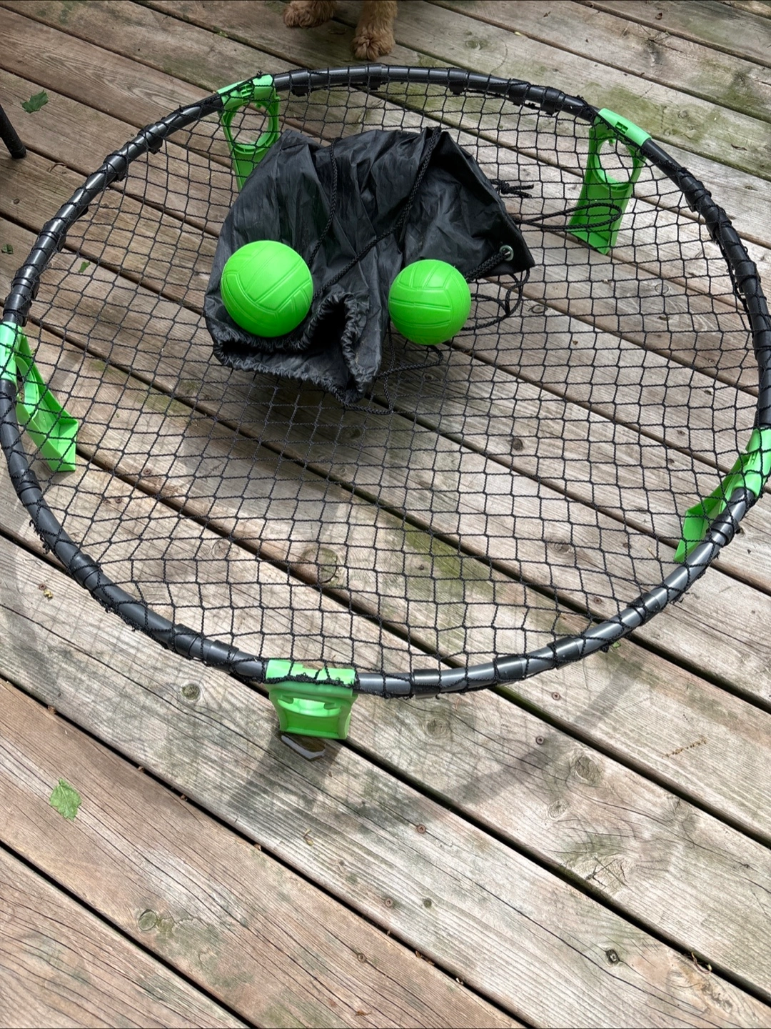 Fun outdoor game. Includes circular net, three lime green balls, and a black carry bag. Great for parties and family fun.