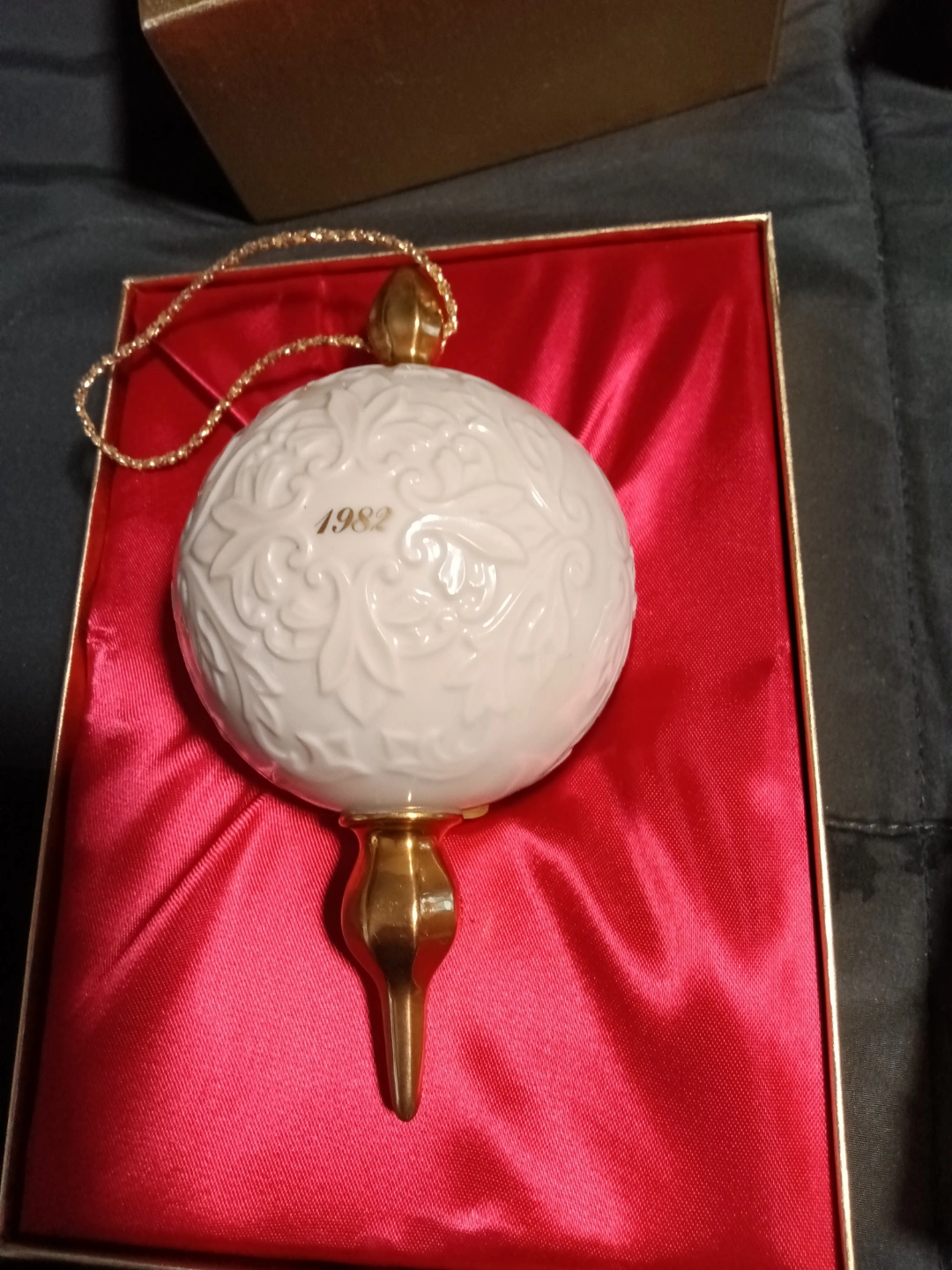 Two Lenox China Christmas ornaments. One is round, one is teardrop shaped. Each comes in its original box. Both ornaments are ivory colored with gold accents and date markings. Collector's items.