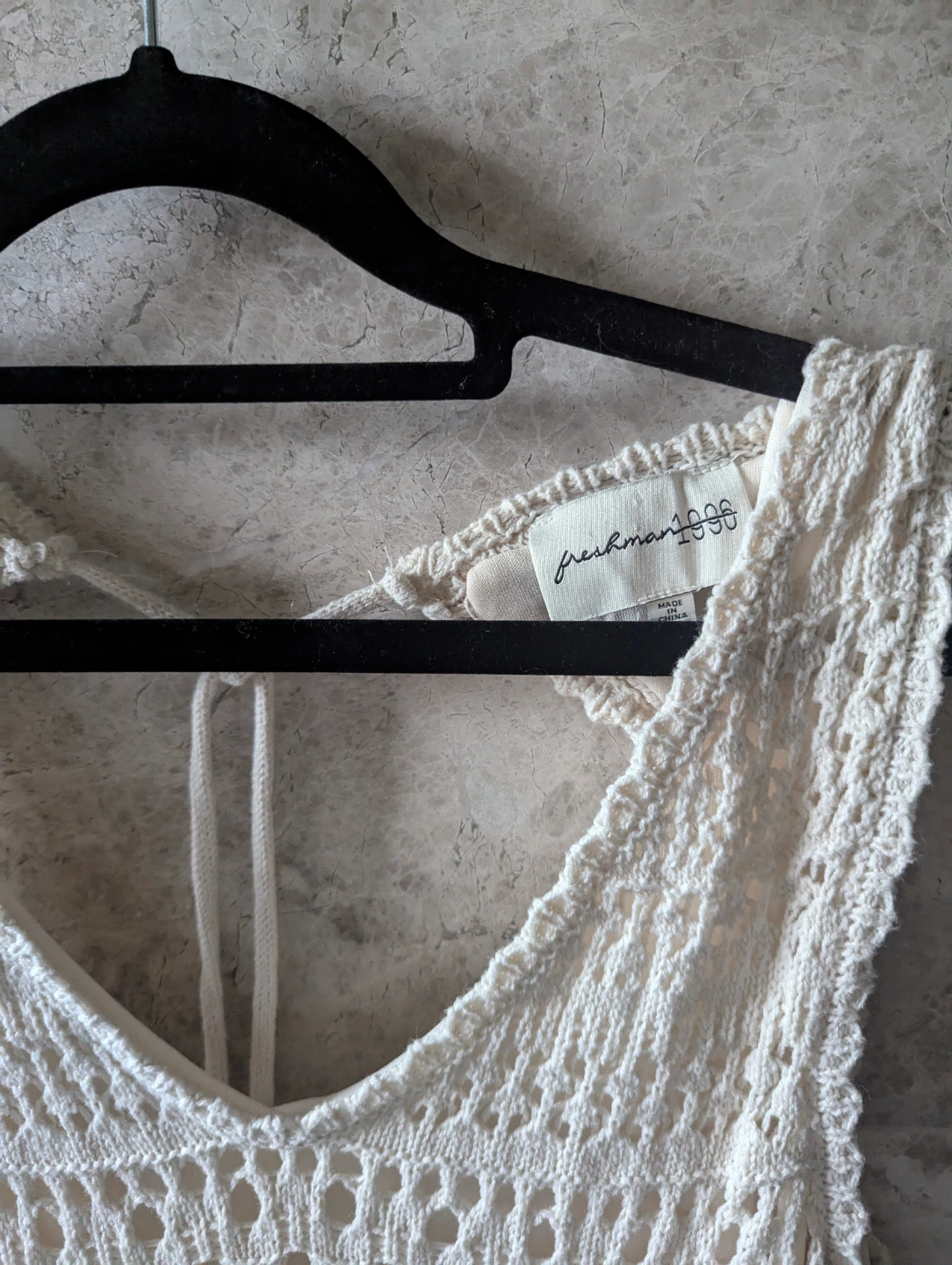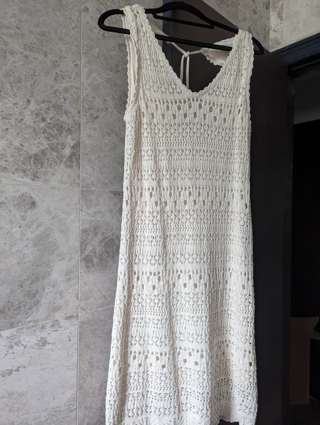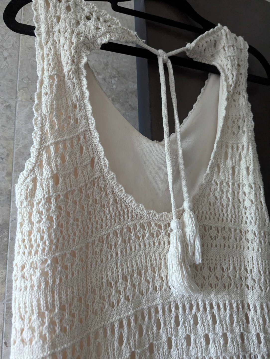 Adorable cream-coloured crochet mini dress. Features a V-neck and tied tassell back detail. Lightweight and perfect for summer. Boho chic.