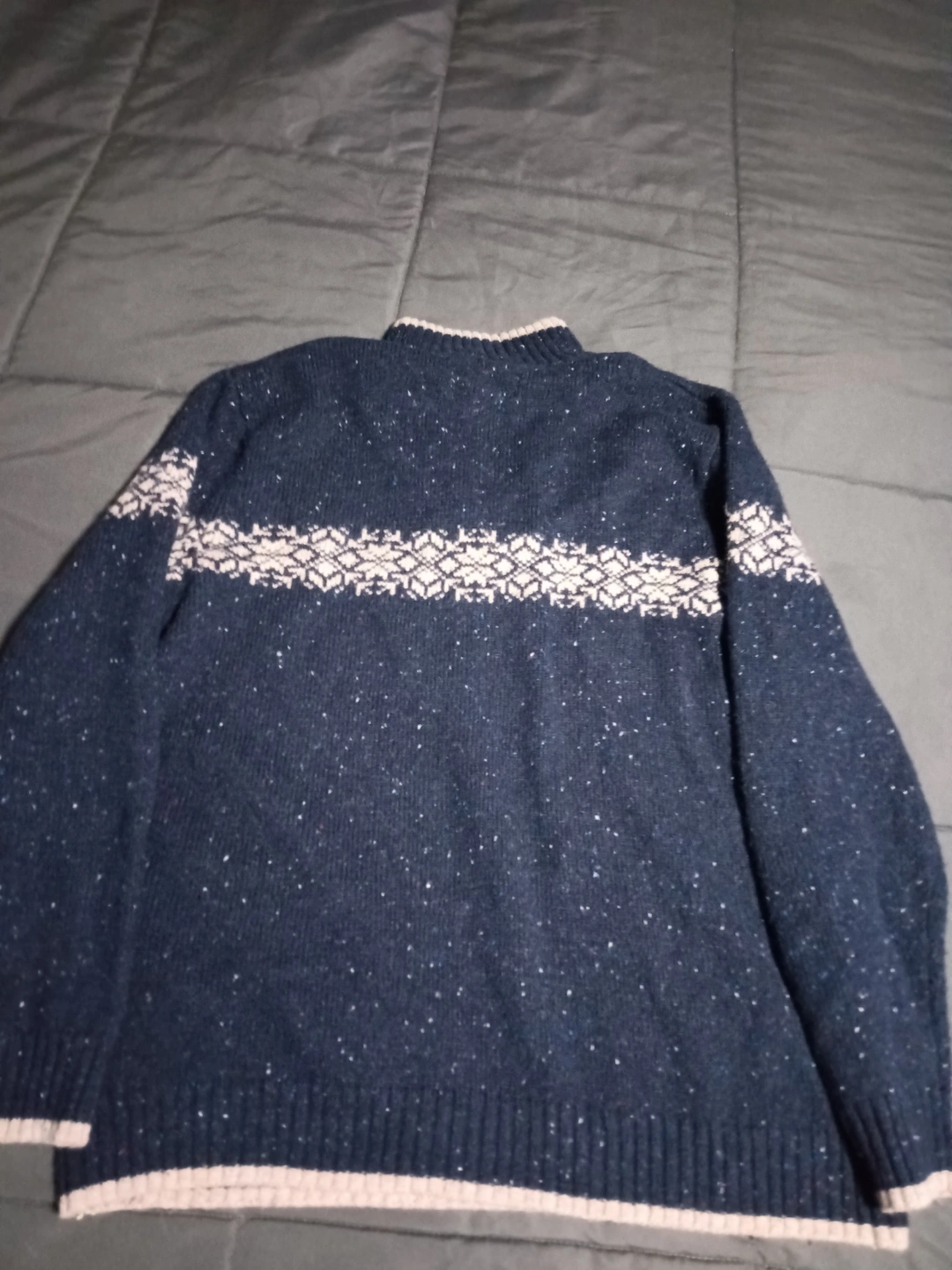 Dark blue 1/4 zip sweater. Features a cream colored neckline and band across the chest, material has specs of red, blue & cream speckled throughout. Size Large, gently used (hubby only used this maybe twice, if that). I loved it, great for jeans (but he didn't care for it). This sweater was an over $40 purchase when new. Pickup is in Maspeth Queens, blks from LIE.