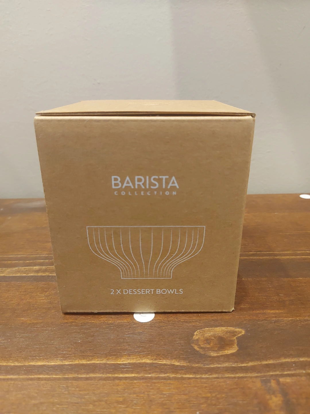 Two clear glass dessert bowls from Nespresso which are part of the Nespresso Barista Collection.
