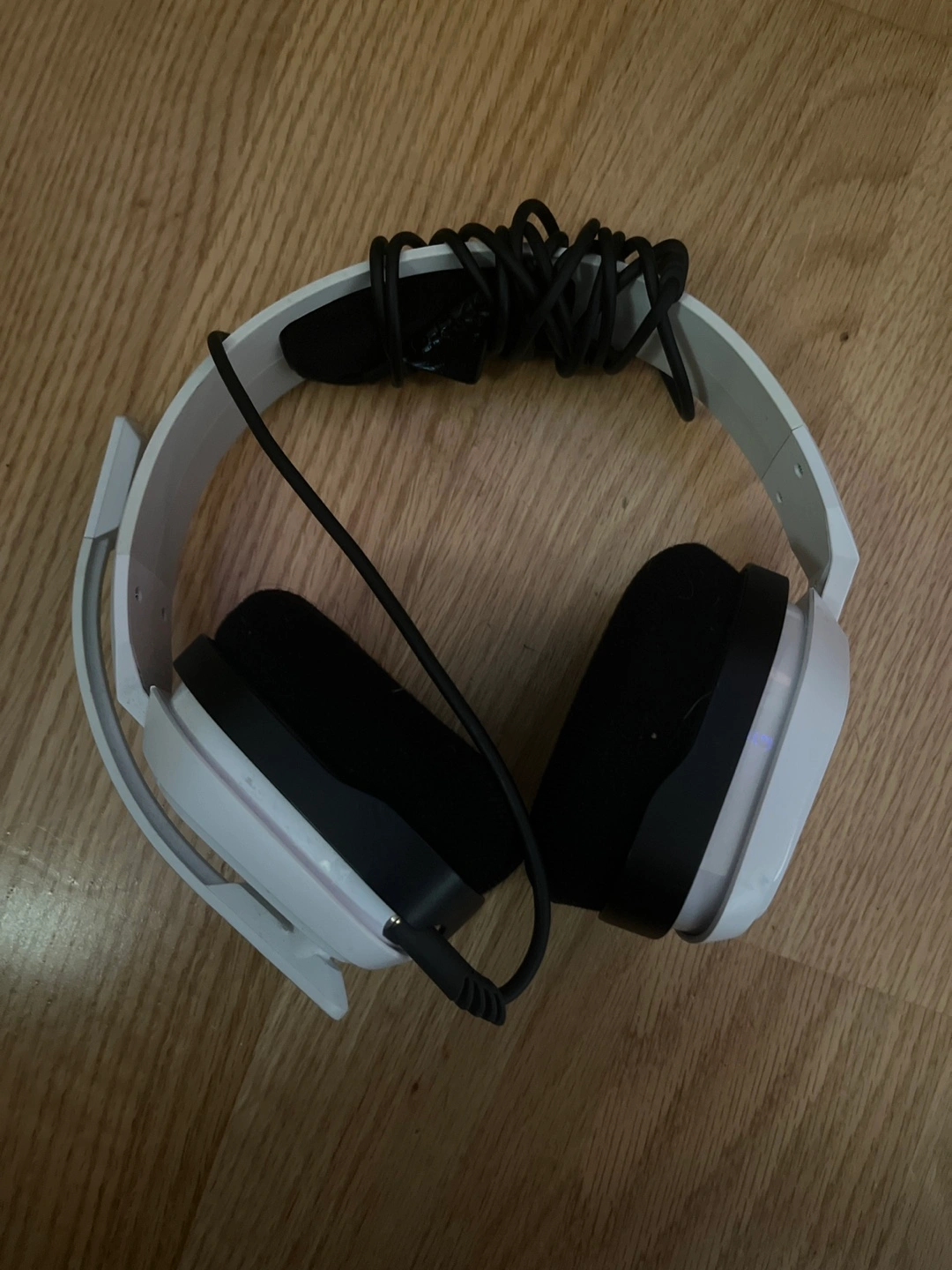 Comfortable over-ear headphones. White plastic headband and earcups. Black cushioned earcups. Wired connection. Great for gaming.
