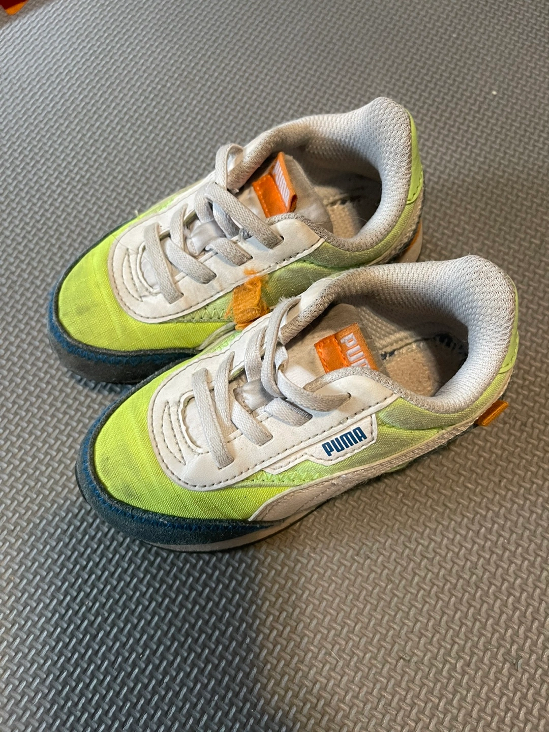80Used children’s Puma sneakers. Lime green, grey, and navy blue colour scheme. Lace-up closure. Size 8C