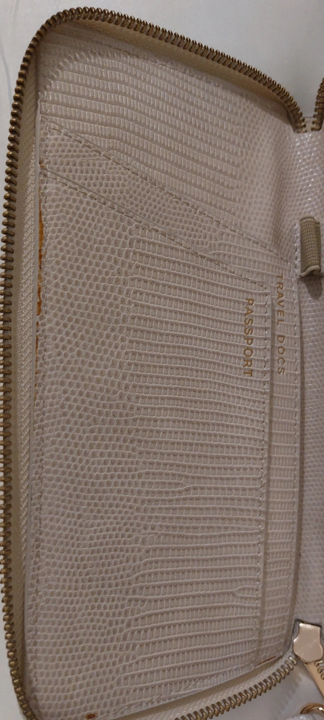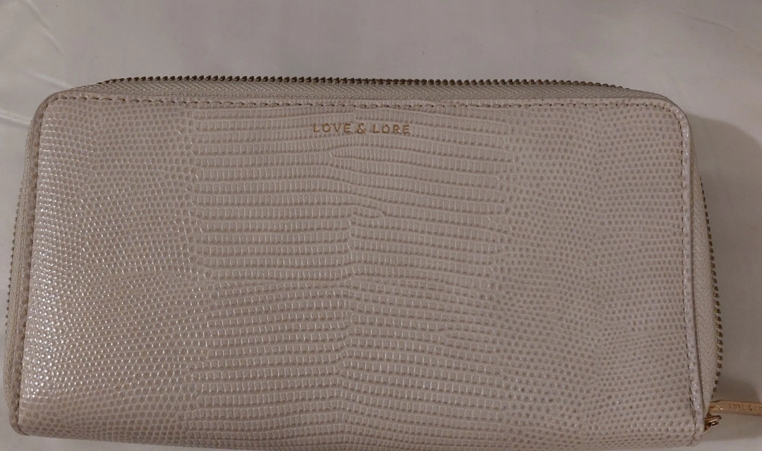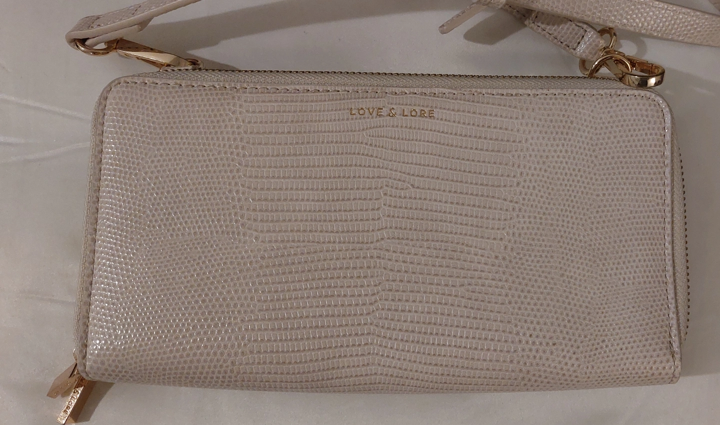 Beige LOVE & LORE crossbody wallet. Features a zip closure, removable strap, and multiple card slots. Snakeskin-embossed leather. Golden hardware.