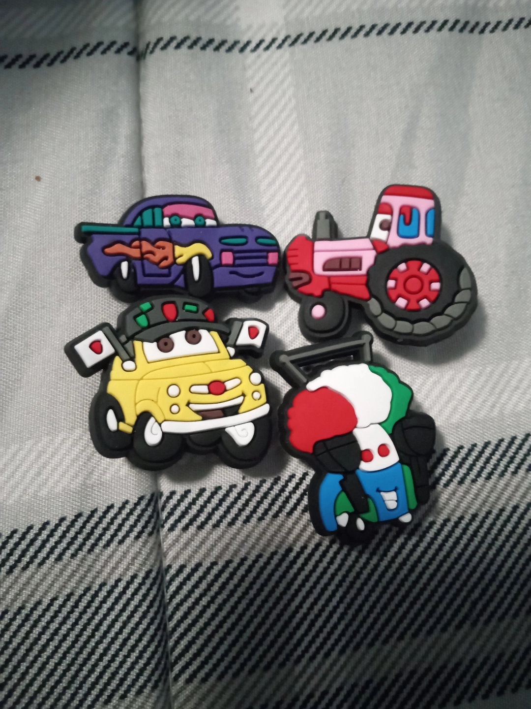 cute car shoe charms. Includes a purple race car, pink tractor, yellow tow truck, and a clown. Great for Crocs or other shoes.
