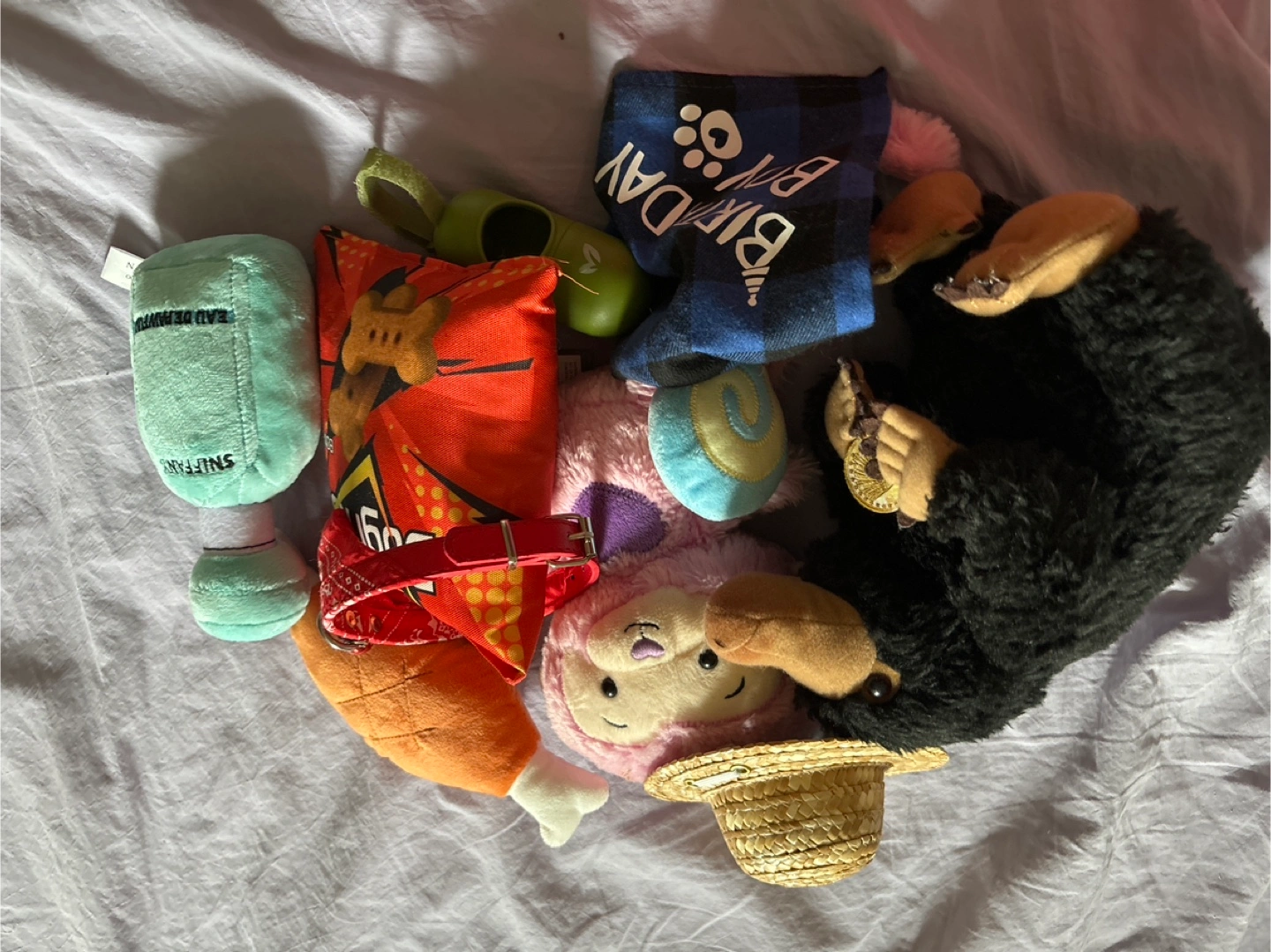 Adorable dog toy bundle! Includes a birthday bandana, several plush toys, poop bag dispenser, and a collar. Great for small to medium-sized dogs.