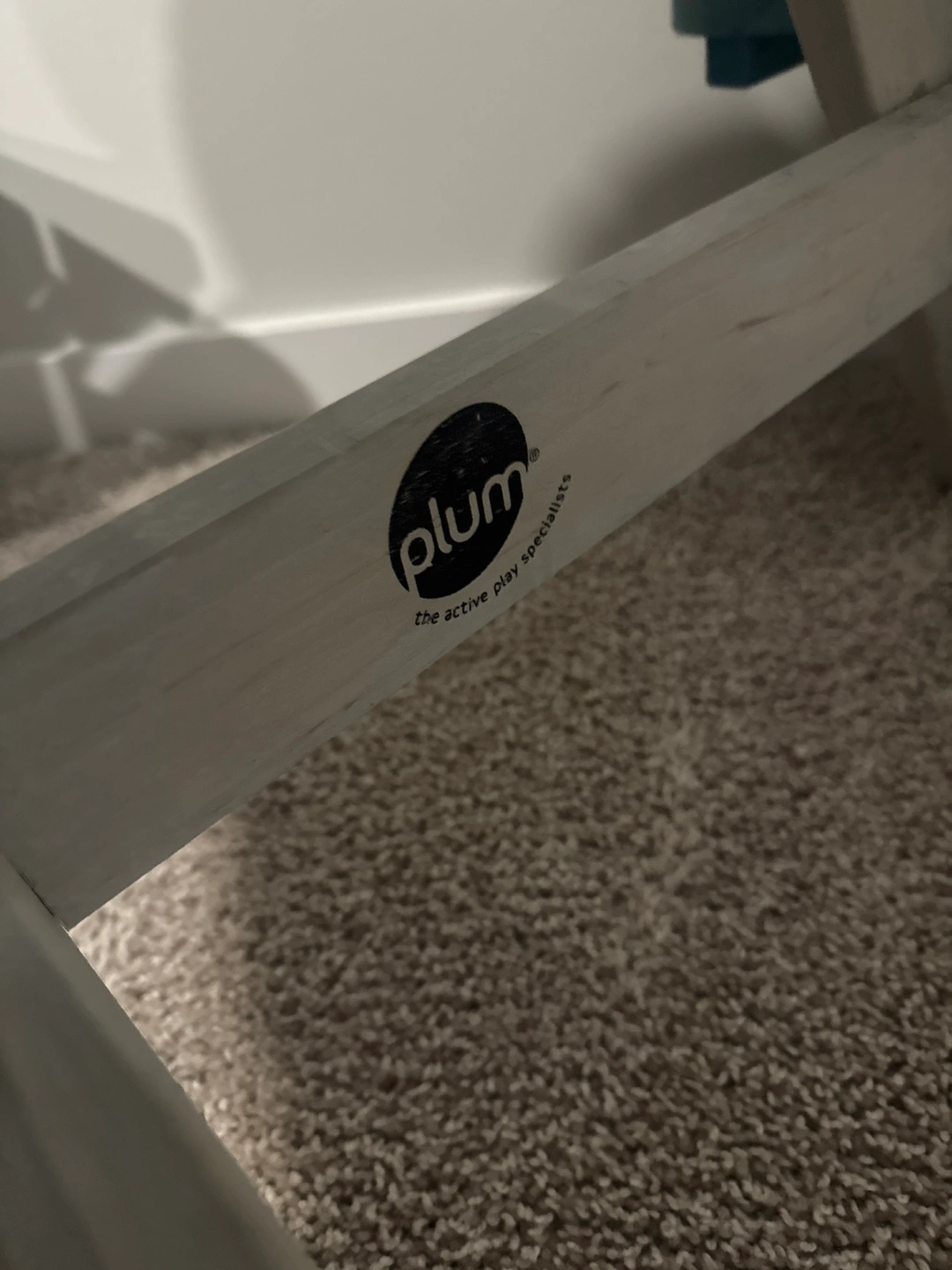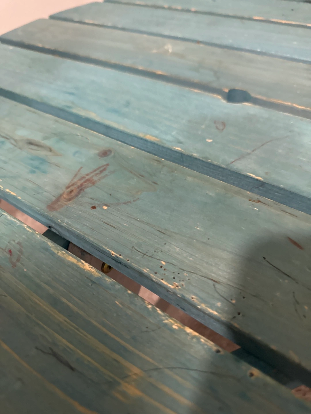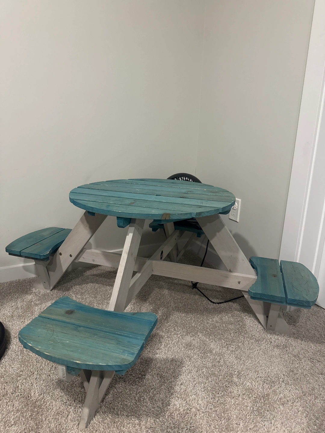 Kids' picnic table. Round table and four seats. Blue and white. Some minor marks on the tabletop/seats. Used indoors only so no weather damage.