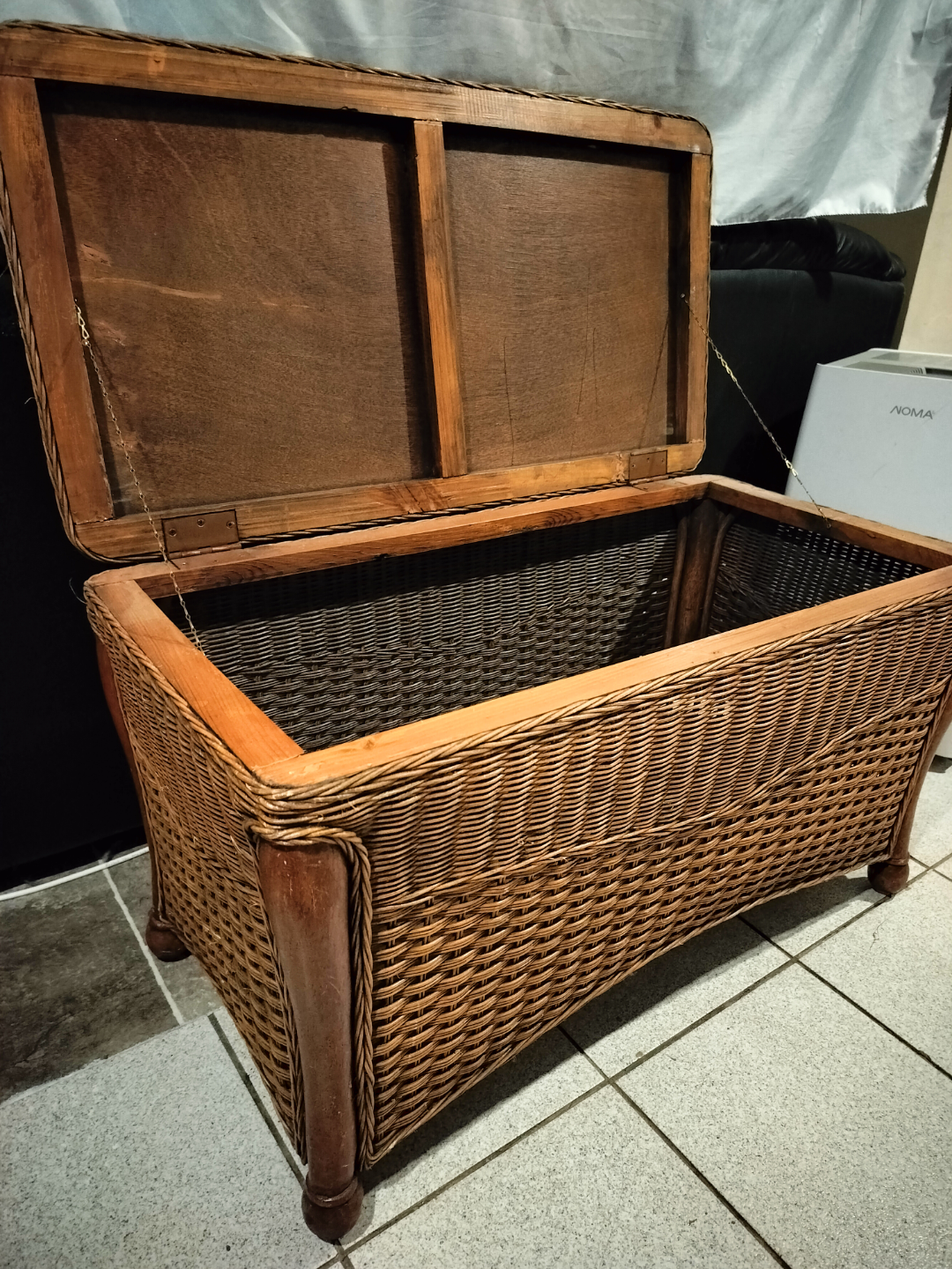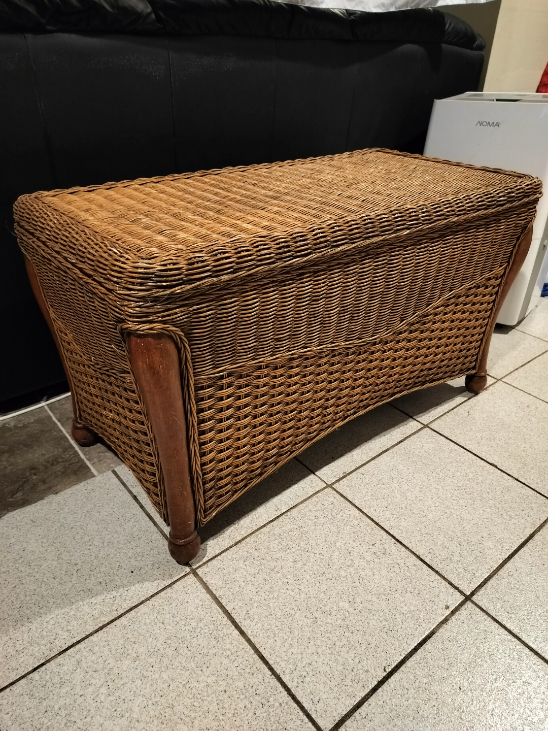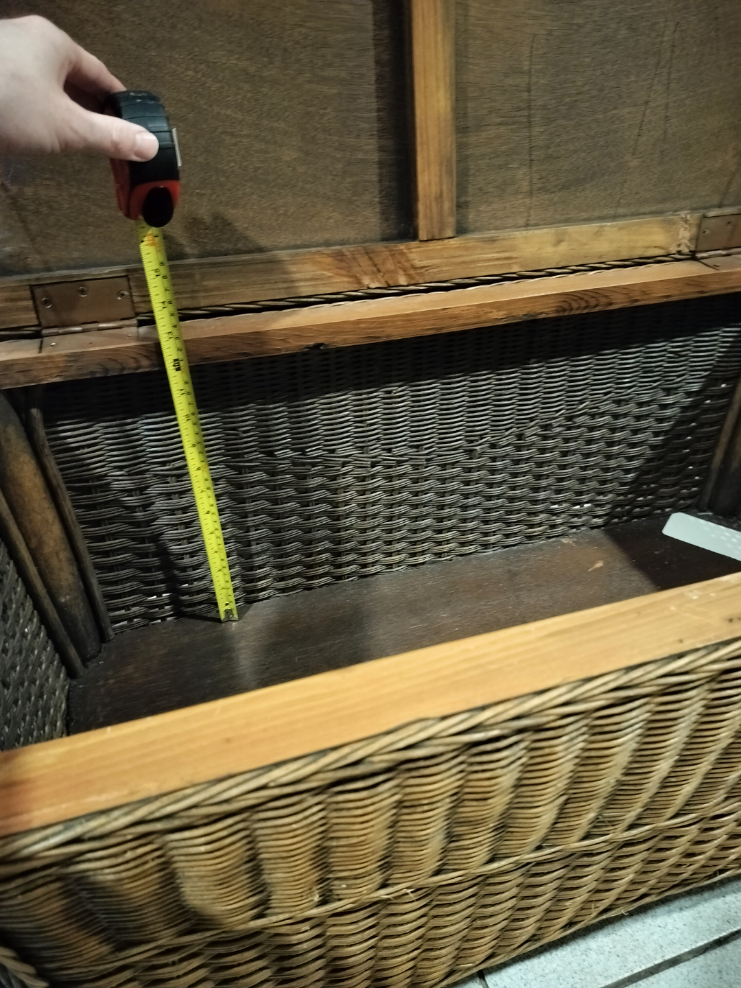 Large wicker storage trunk. Wooden accents. Hinged lid. Spacious interior. Good for storage or as a coffee table. Approximately 21" tall, 36" wide, and 17" deep.