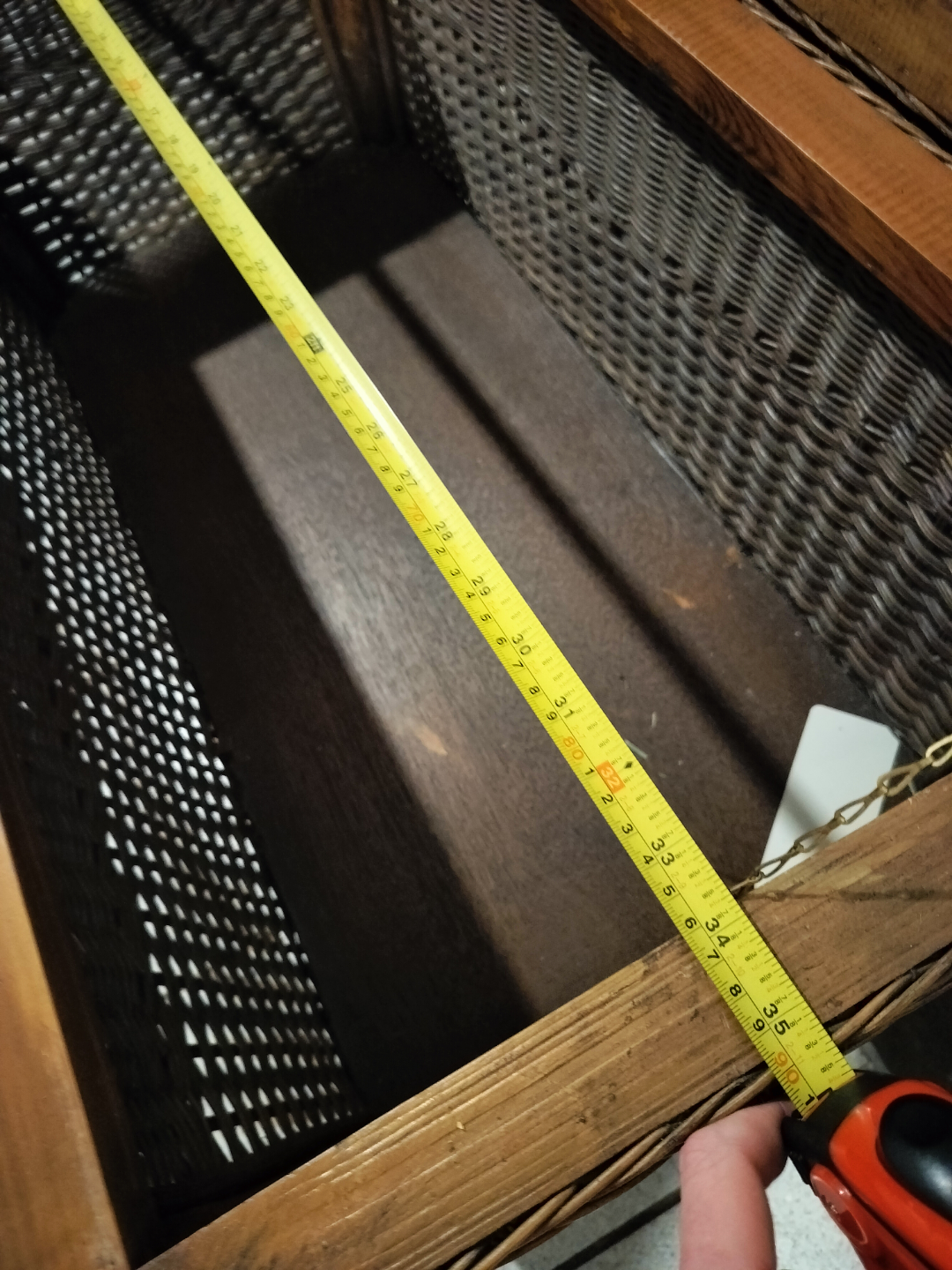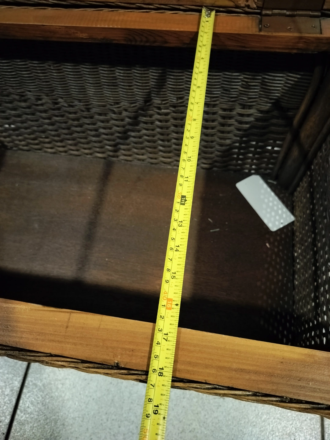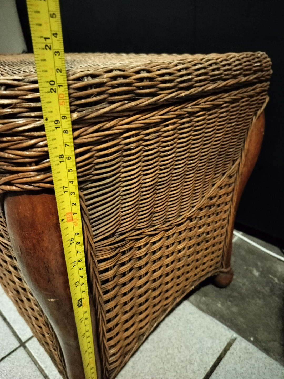 Large wicker storage trunk. Wooden accents. Hinged lid. Spacious interior. Good for storage or as a coffee table. Approximately 21" tall, 36" wide, and 17" deep.