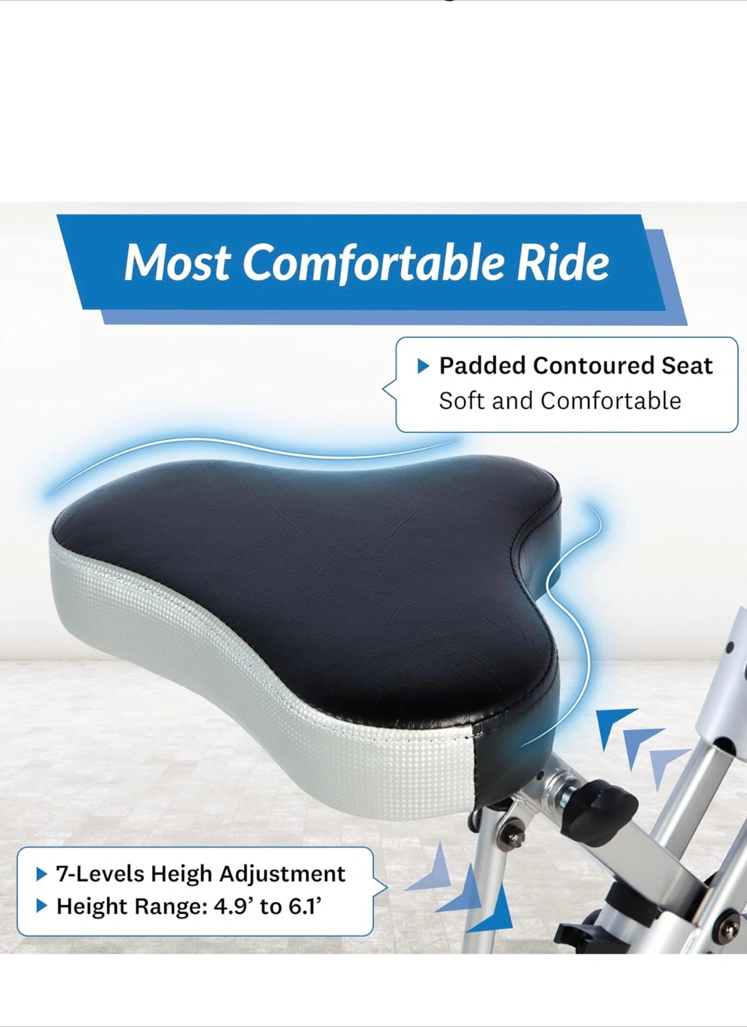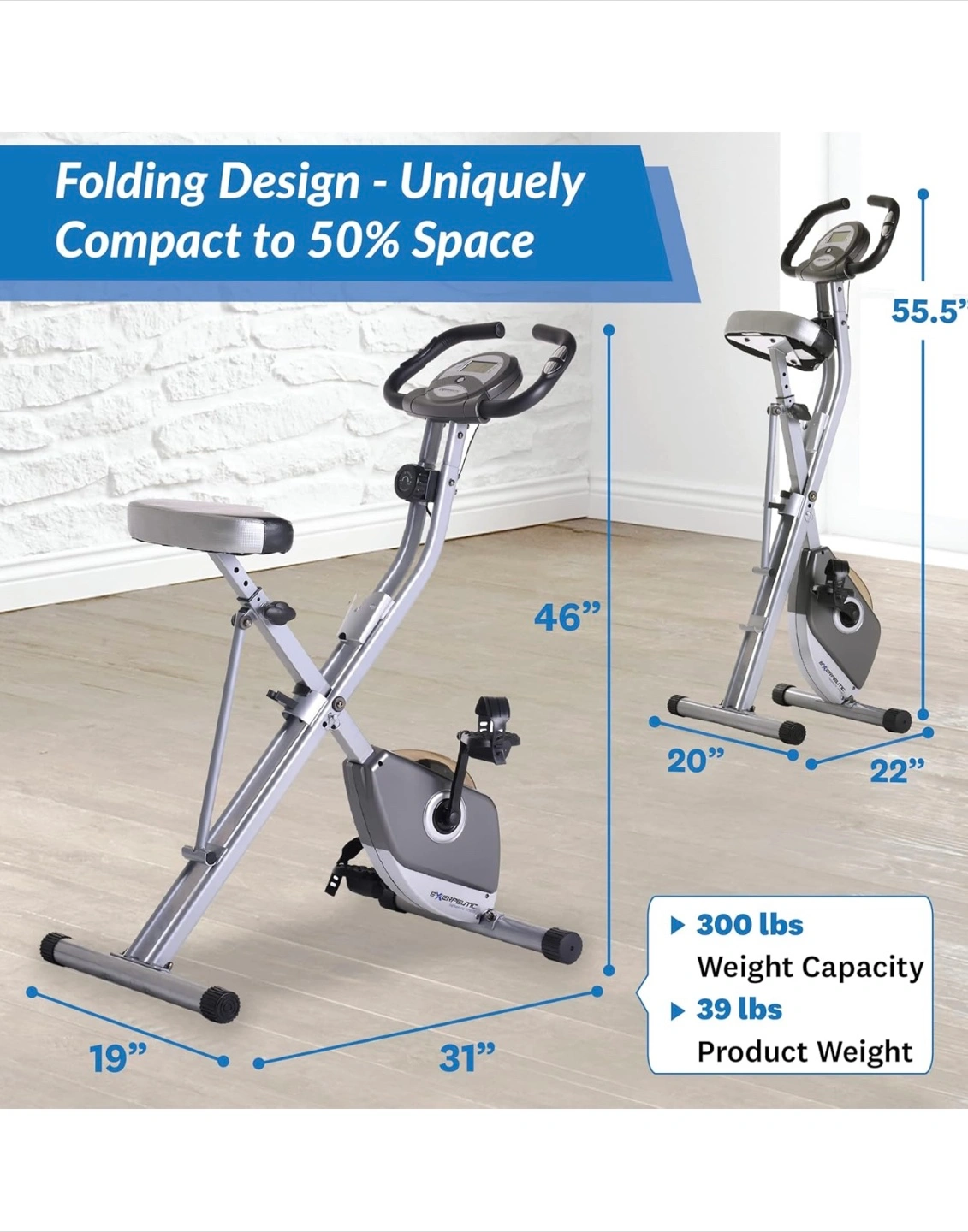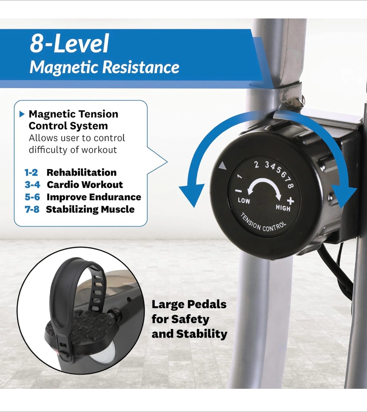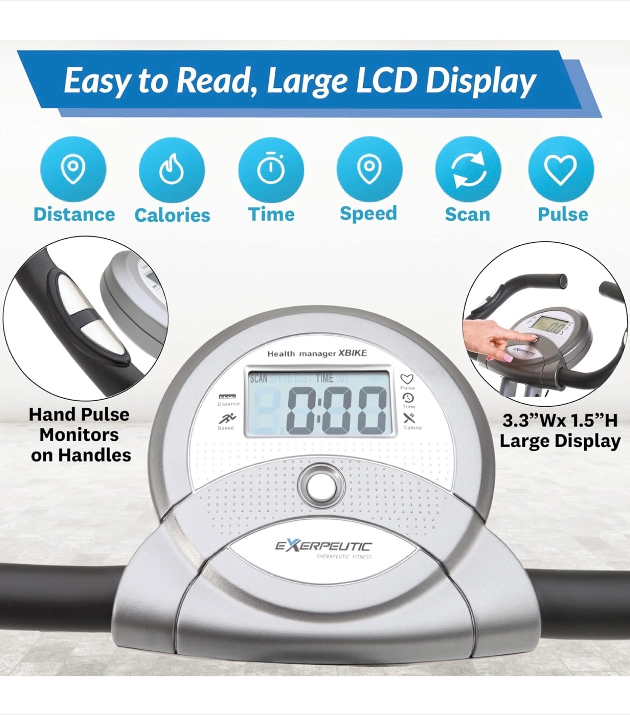 Space-saving foldable design. Magnetic resistance for a quiet workout. Features an LCD display showing distance, calories, time, speed, scan, and pulse. Includes hand pulse monitors. Eight levels of magnetic resistance. Large pedals for stability.