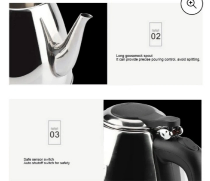 87Cordless electric kettle. Stainless steel construction. Boils water quickly. Automatic shutoff. Easy pouring. 1.2 litre capacity. New, in box.