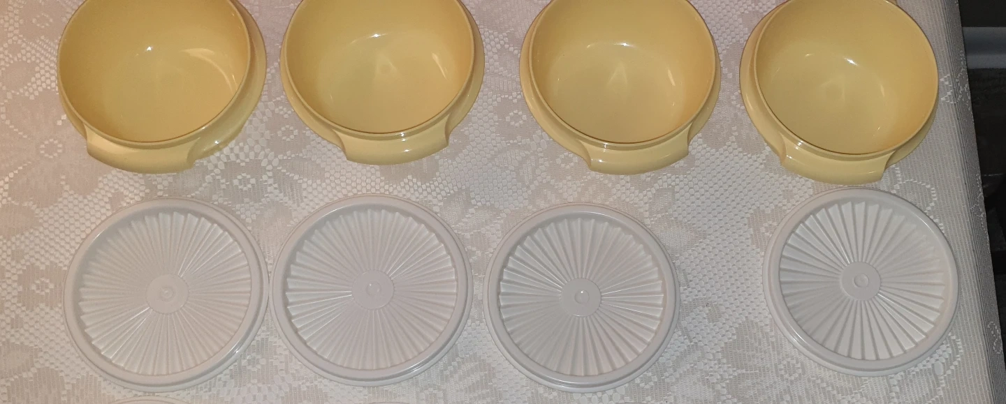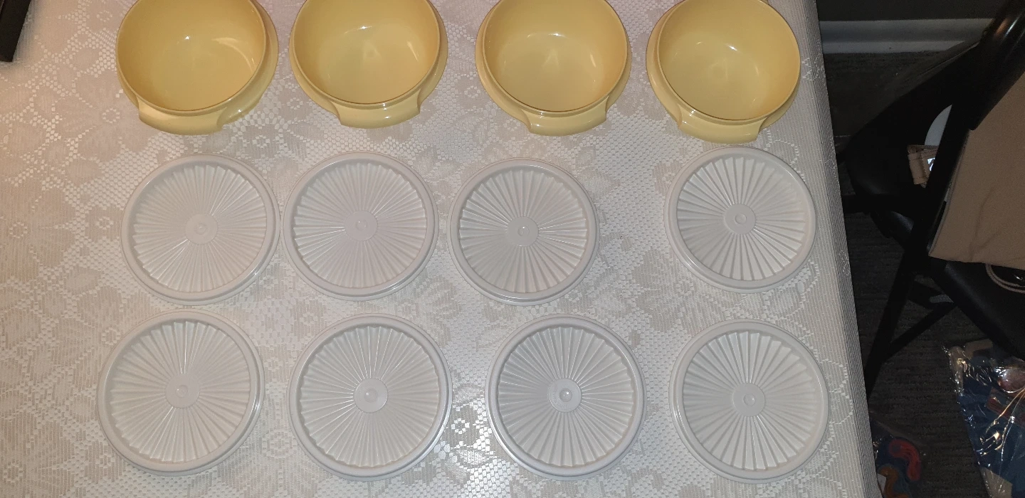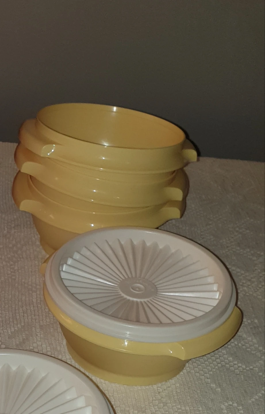 New, never used. Set of vintage style yellow Tupperware bowls. Matching lids included. Great for storage or serving. $10.00 each or 4 for $25.00. Cash only please.