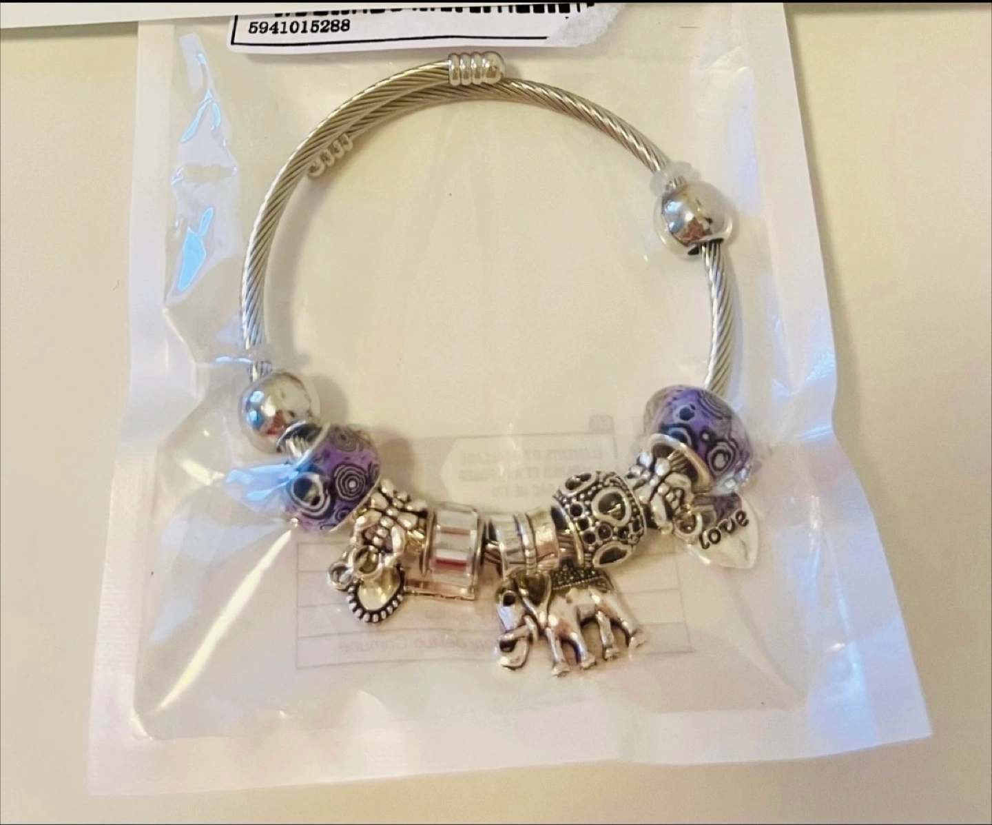A Stylish bracelet, silver-toned metal, purple glass beads, elephant and heart charms.