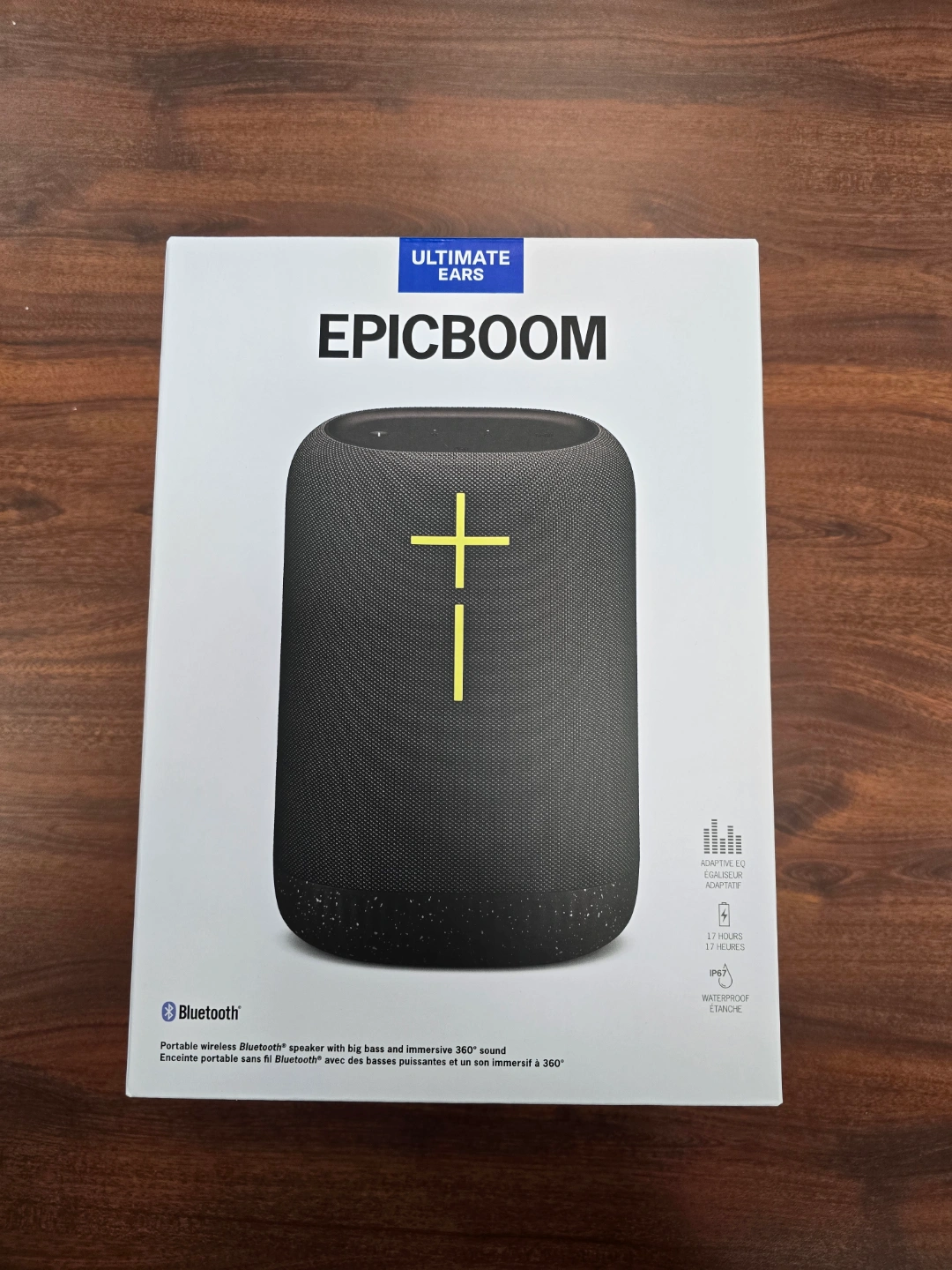 The Ultimate Ears EPICBOOM is a portable, waterproof Bluetooth speaker with 360-degree sound, adaptive EQ, and a 17-hour battery life. It's known for its strong bass, impressive sound quality, and durable construction, making it suitable for various indoor and outdoor environments.