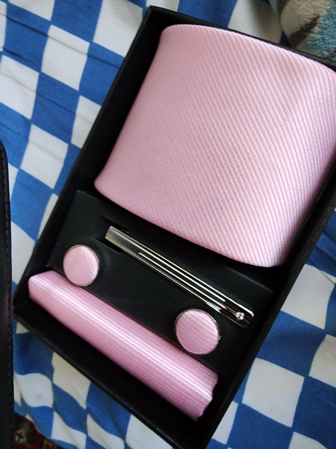 New pink tie, tie bar, and cufflinks. All in a gift box. Perfect for a wedding or special occasion.