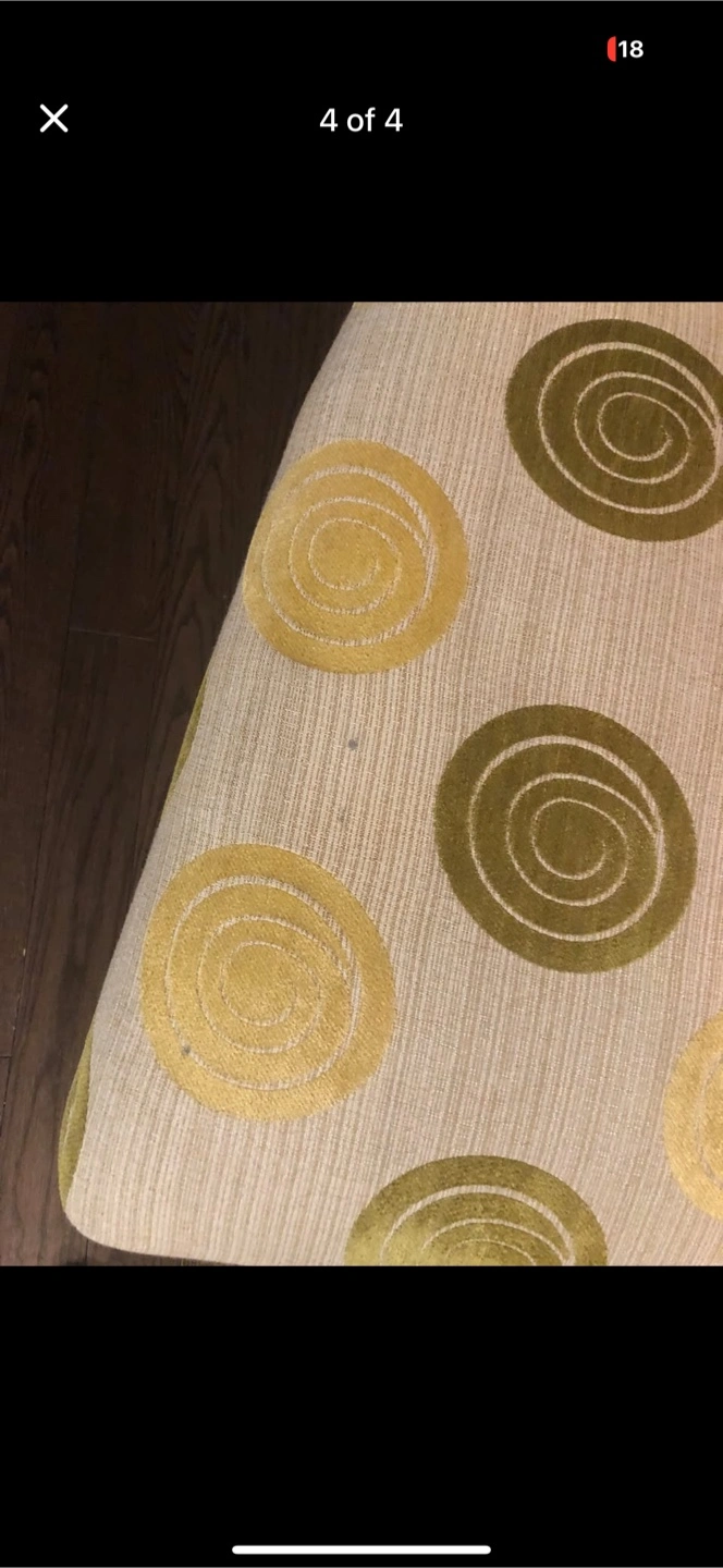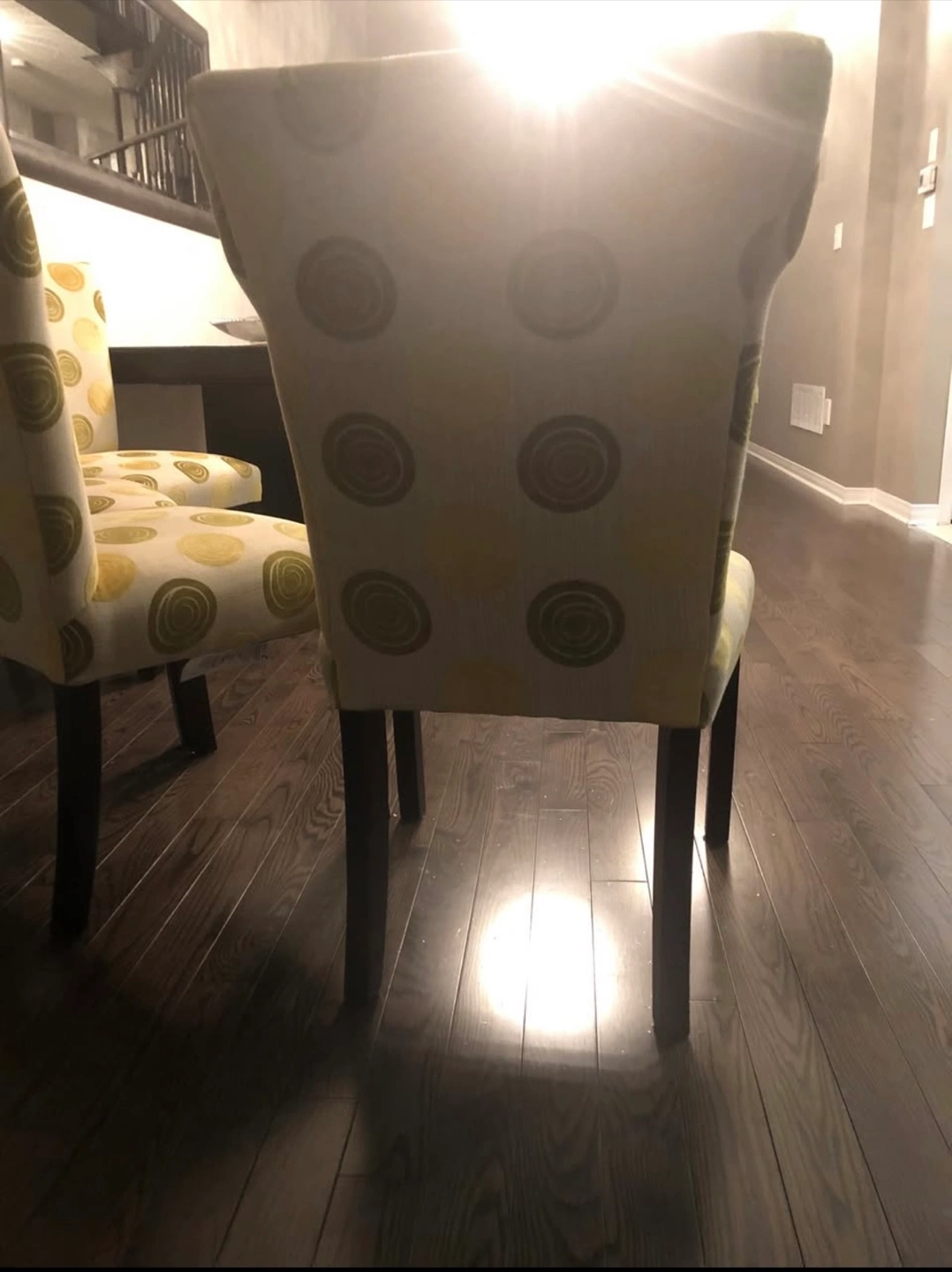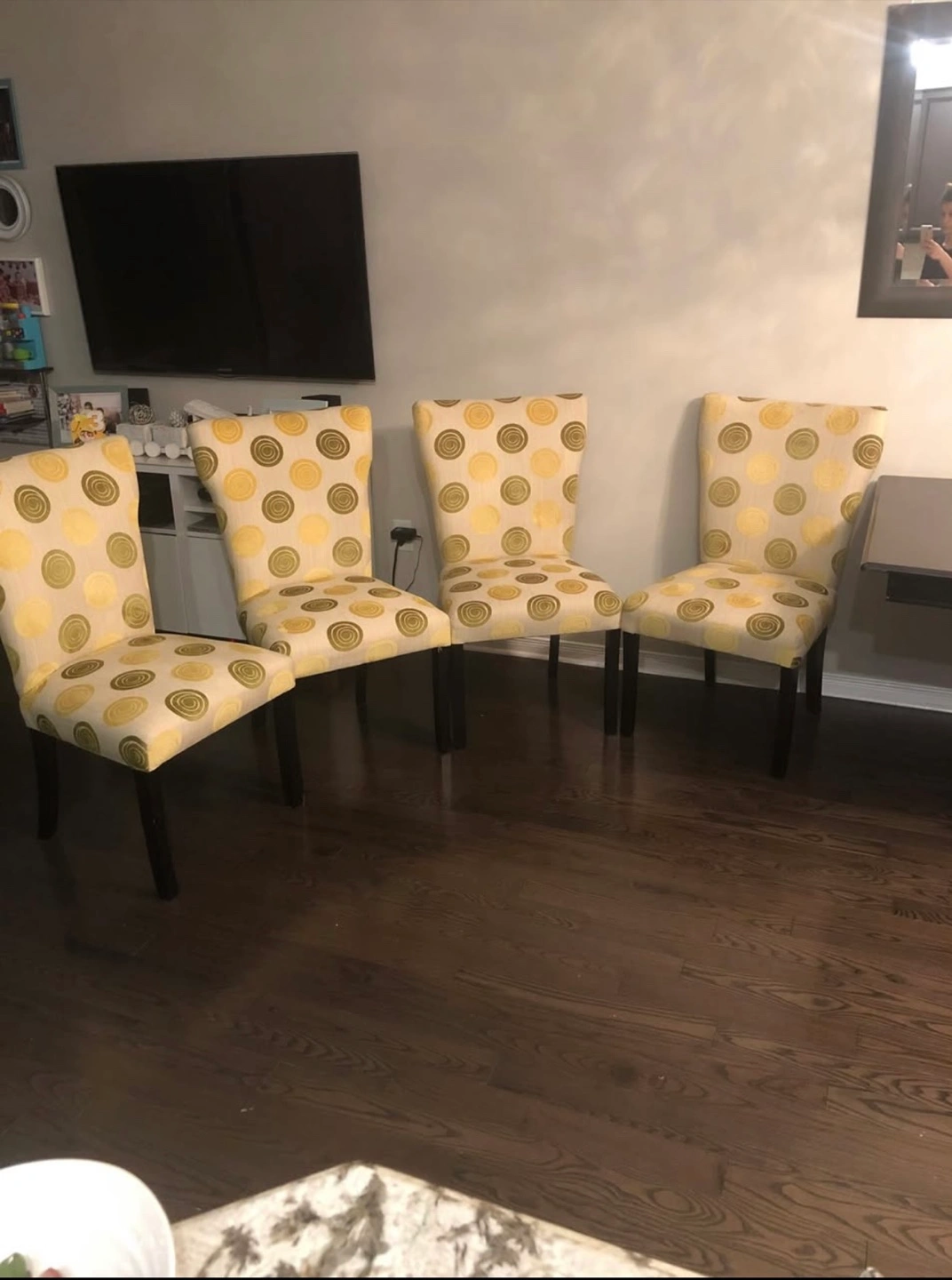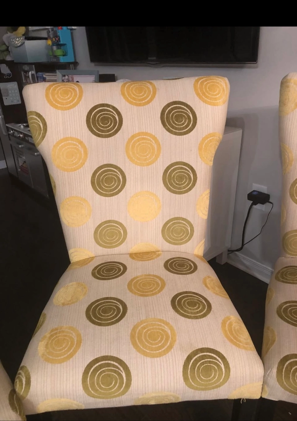 8 dining chairs. Only 4 shown . Great quality . High and wide back makes these chairs very comfortable. Beige fabric with olive green and gold swirl pattern. Dark brown legs. Used condition.