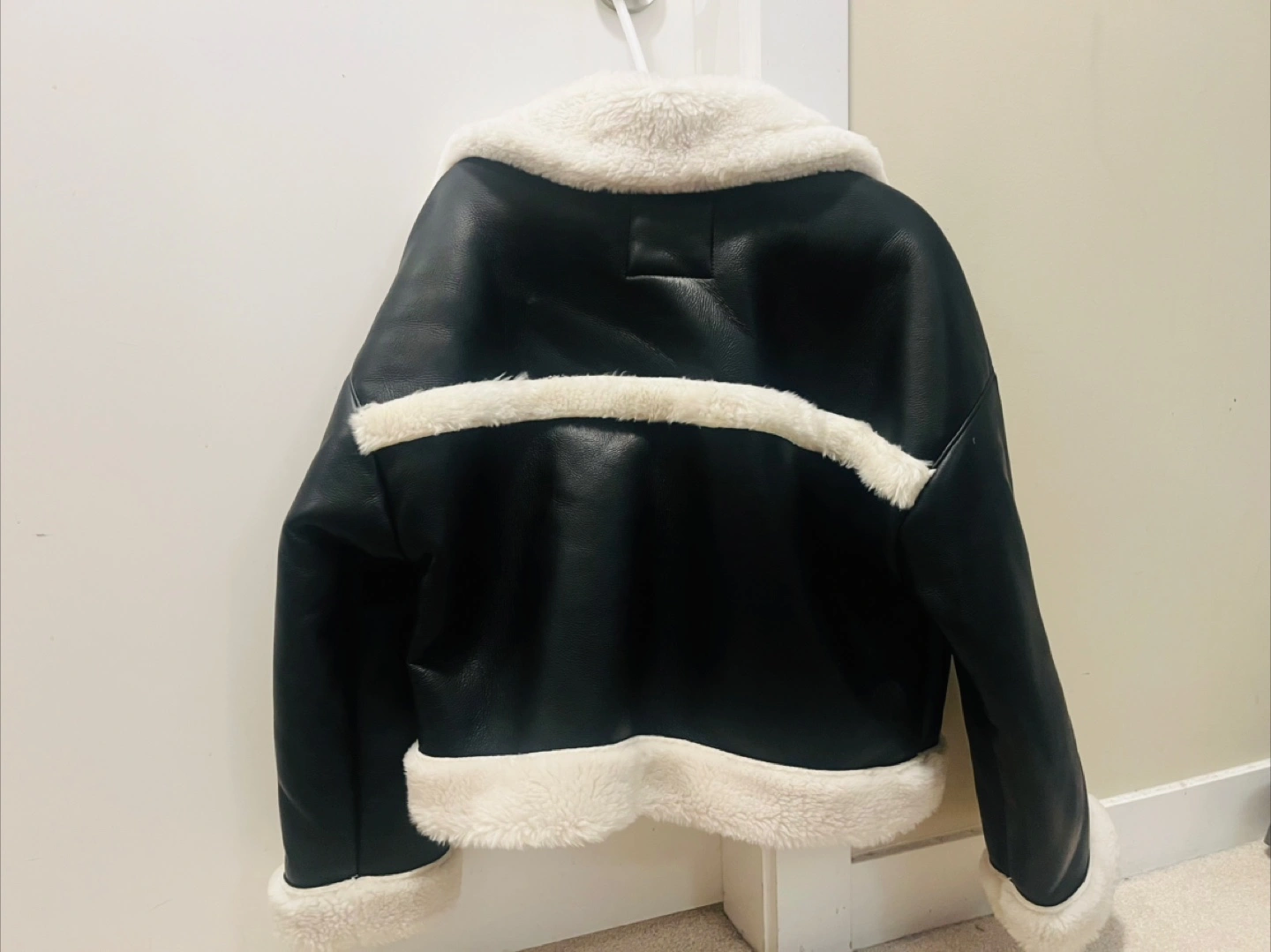 Brand new Black faux leather aviator jacket. Features cream coloured sherpa lining and trim. Size small. Selling because it doesn’t suit me.