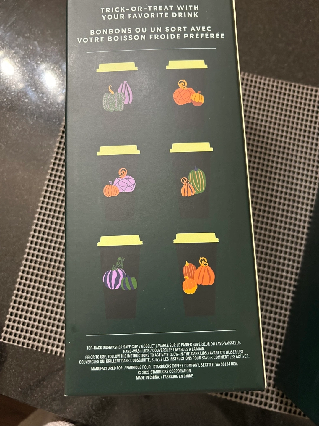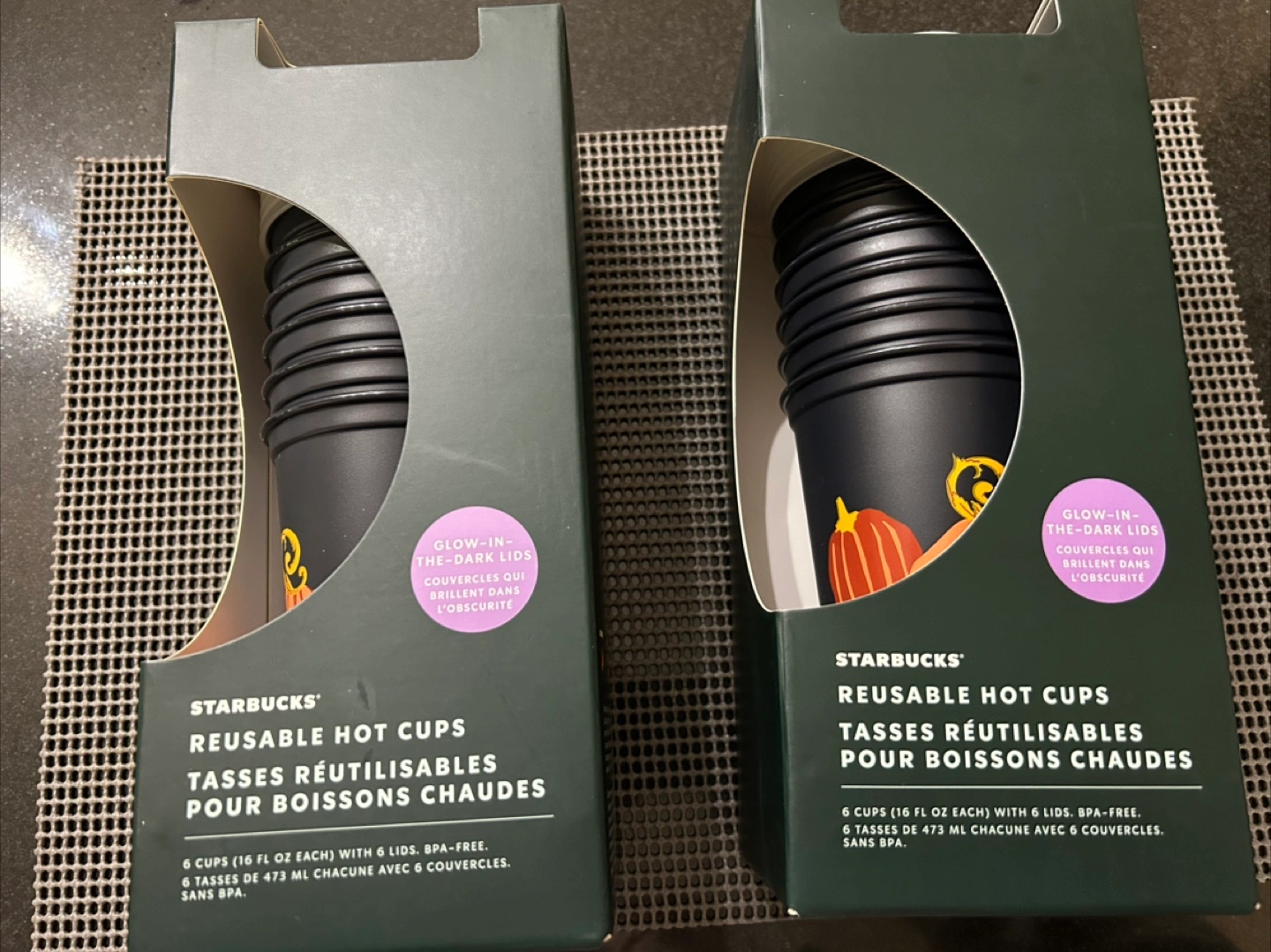 Two sets of six reusable Starbucks hot cups. Each cup holds 16 fl oz. Includes lids. BPA-free. Glow-in-the-dark lids. Autumn-themed design. New and in original packaging.