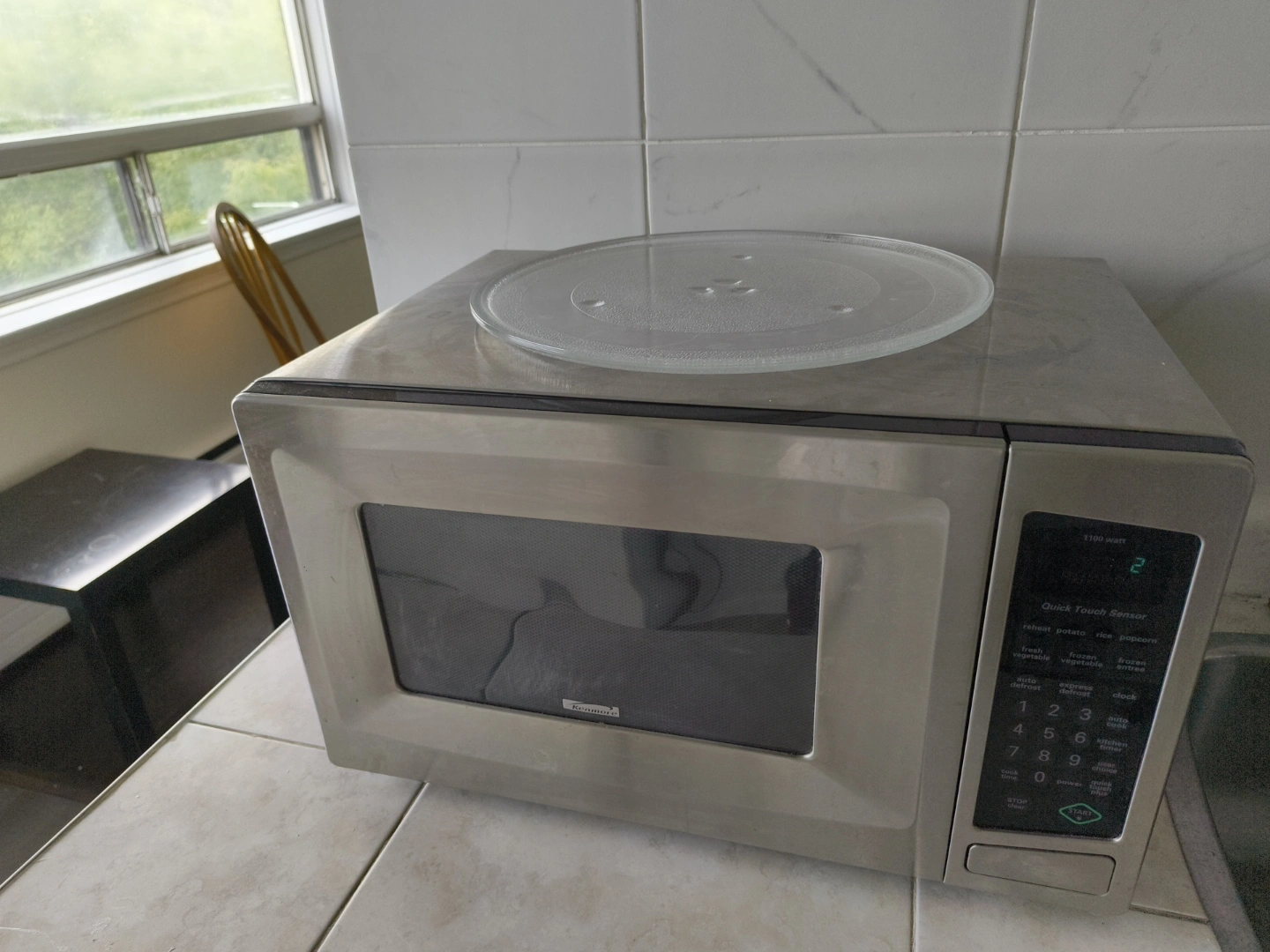 Stainless steel microwave. Quick touch sensor controls. Includes extra glass turntable.
