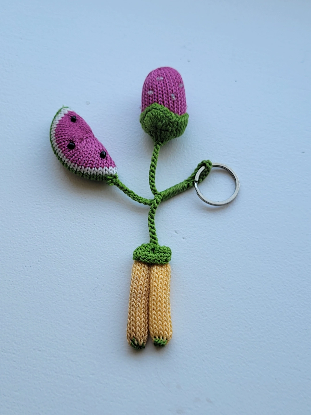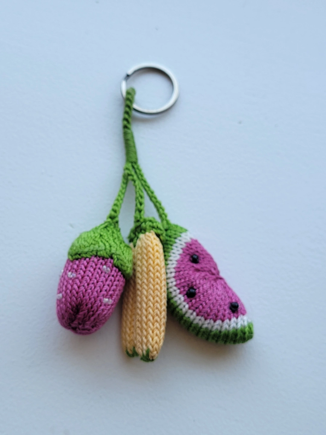 New. Adorable handmade keychain featuring a strawberry, watermelon slice, and banana. Knitted with colourful yarn. Unique and charming accessory.