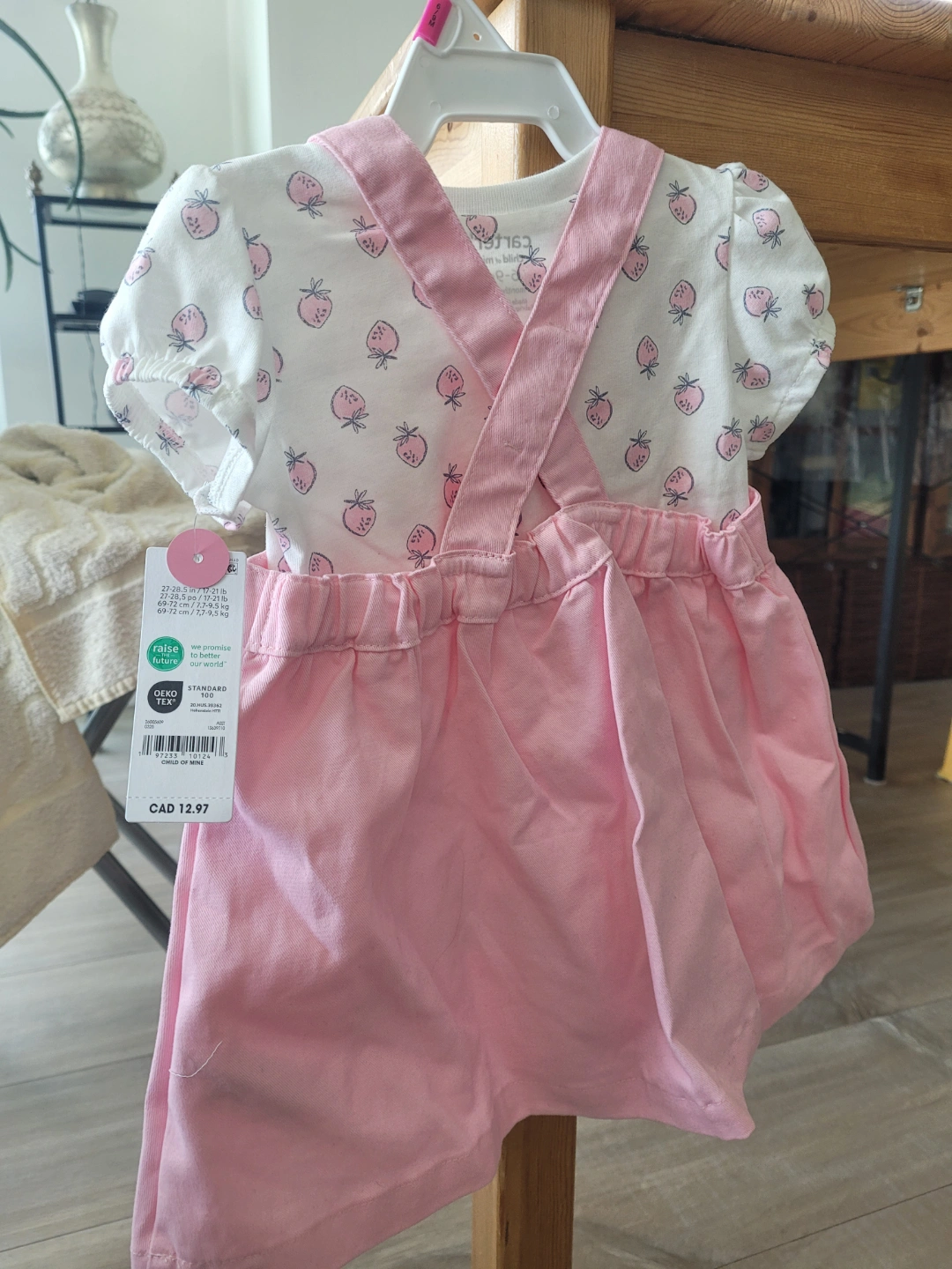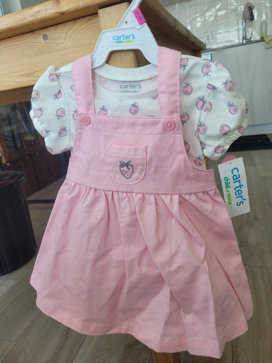 Adorable pink strawberry outfit. Short sleeve top and pinafore dress. Size 6-9 months. 100% cotton. brand new with tags.