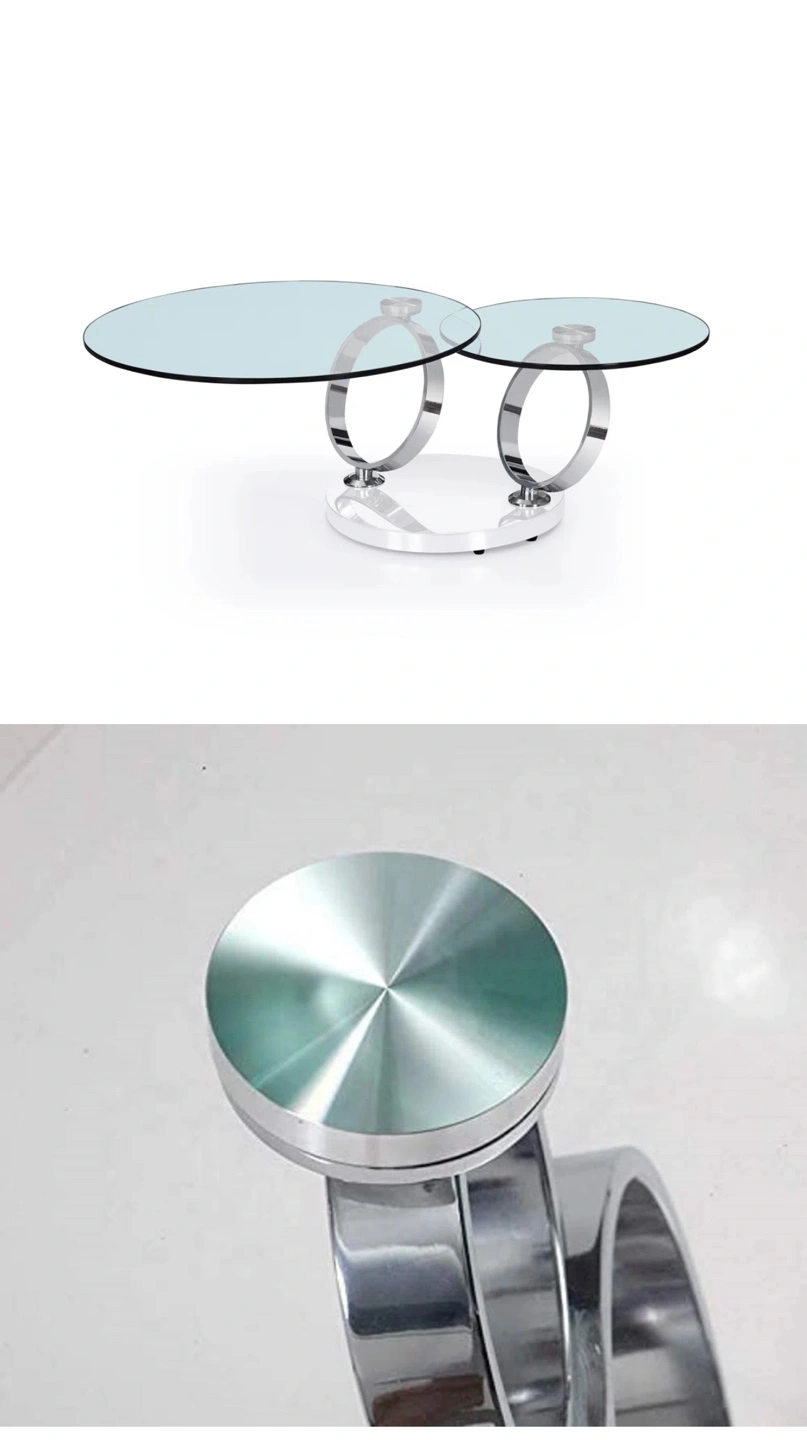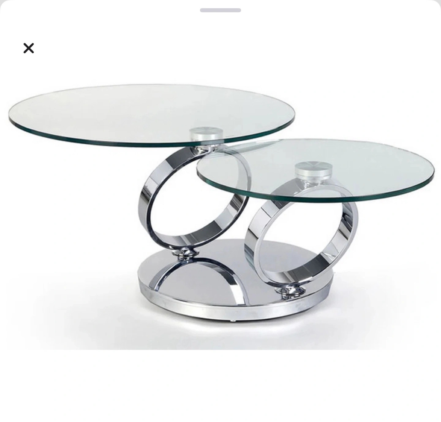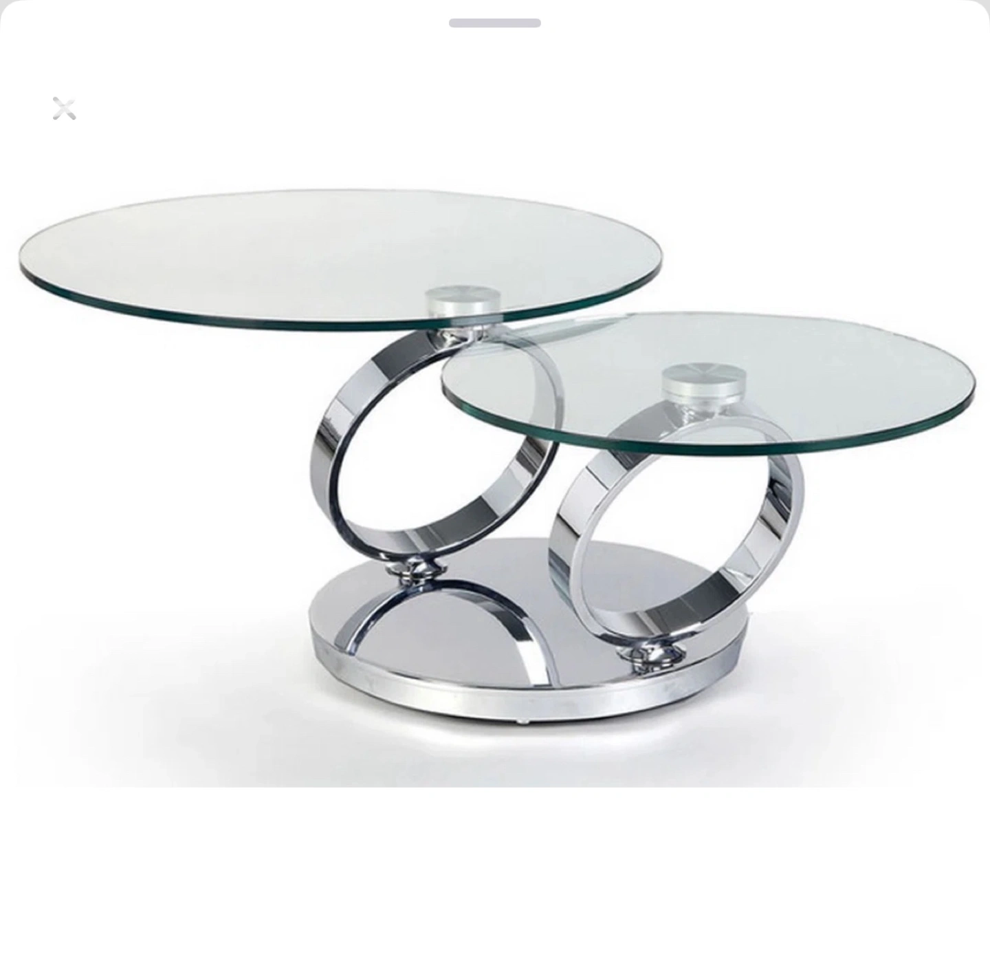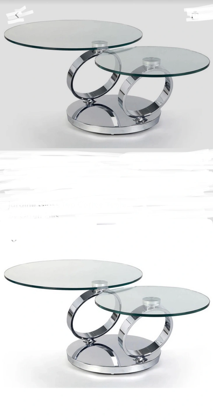 Stylish two-tiered coffee table. Features tempered glass tops and a sleek chrome metal frame. Perfect for contemporary living spaces. Minimalist design.