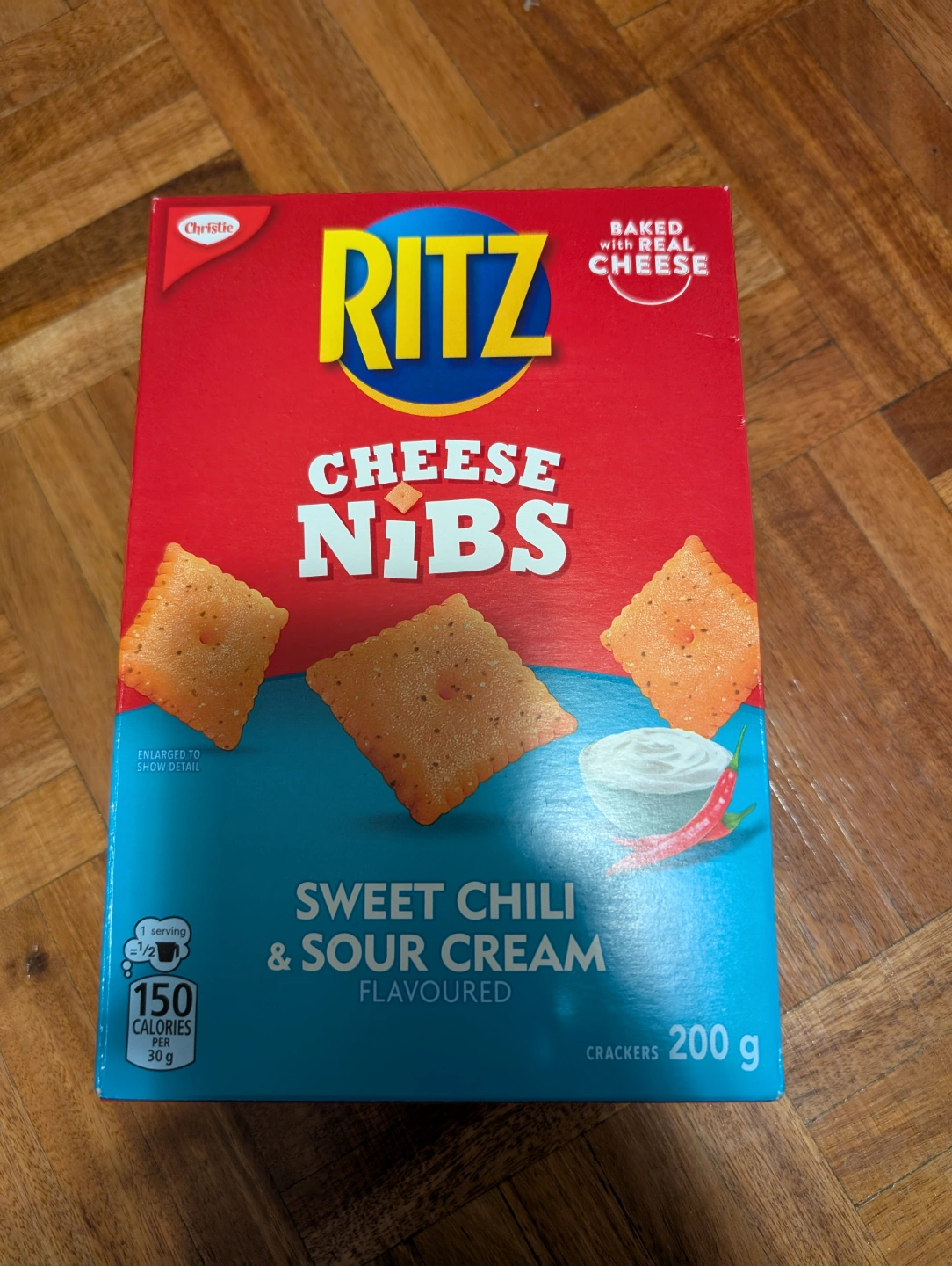672Box of Ritz Cheese Nibs crackers. Sweet Chili & Sour Cream flavour. 200 grams.