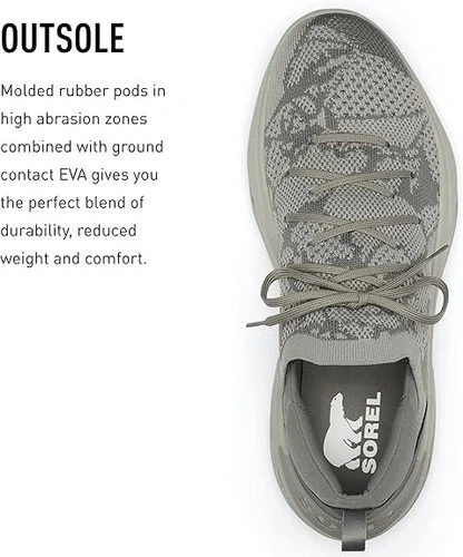 Brand new with box. A small line on the midsole is visible from manufacturing — this is a normal mold line found on all EVA foam soles and is not wear or damage. Shoes have never been worn. These SOREL lace shoes have a soft and breathable engineered knit top with a conventional lace-up fastening for a personalized fit. These shoes allow your feet to breathe freely when running or walking, keeping them dry and cool. Feel reduced weight on your feet to improve job performance with these high-performing casual sneakers. Comfort and fashion come together in stylish SOREL men's casual shoes. The soft collar relieves strain around the ankle, and the eco-friendly heel pull tab makes them a comfortable and sporty pair of casual sneakers for all-day wear, while the breathable textile lining keeps your feet dry and comfy. These breathable shoes for men are made of chemical-free textiles and are built to last. SOREL lace shoes for men are built of modern color palettes that are quite attractive and can be worn everywhere, as well as being durable. These walking shoes for men include a molded grippy EVA outsole for stability and traction, allowing you to go places you've never been before. These rubber sole men's shoes are extremely durable, and excellent for use on slick terrain. On wet days, you can now run with confidence. The extra-sturdy sole provides ankle support for men and alleviates the strain of being on your feet all day, while TPU overlays in the toe tip boost the stability of these men's fashion sneakers. Men's lace shoes that are both comfortable and athletic are ideal for all-day wear. This design demonstrates that you travel your own road, your own way! These sneakers for men have removable insoles for extra security and added comfort. It is a slip-on men's shoe with pull loop at the heel for easy and convenient wear. This lightweight footwear for men is appropriate for gym workouts, walking, jogging, biking, hiking, traveling, or any other event. These casual sneakers give superior comfort as well as an appealing appearance. The appropriate pair of SOREL sneakers will lead you to new places. It is soft and comfy, allowing for natural foot mobility. The goal of minimalist walking shoes for men is to provide feet flexibility to move and operate as if walking barefoot. Wearing these SOREL men’s sneakers will show your pals that the world is at your feet.