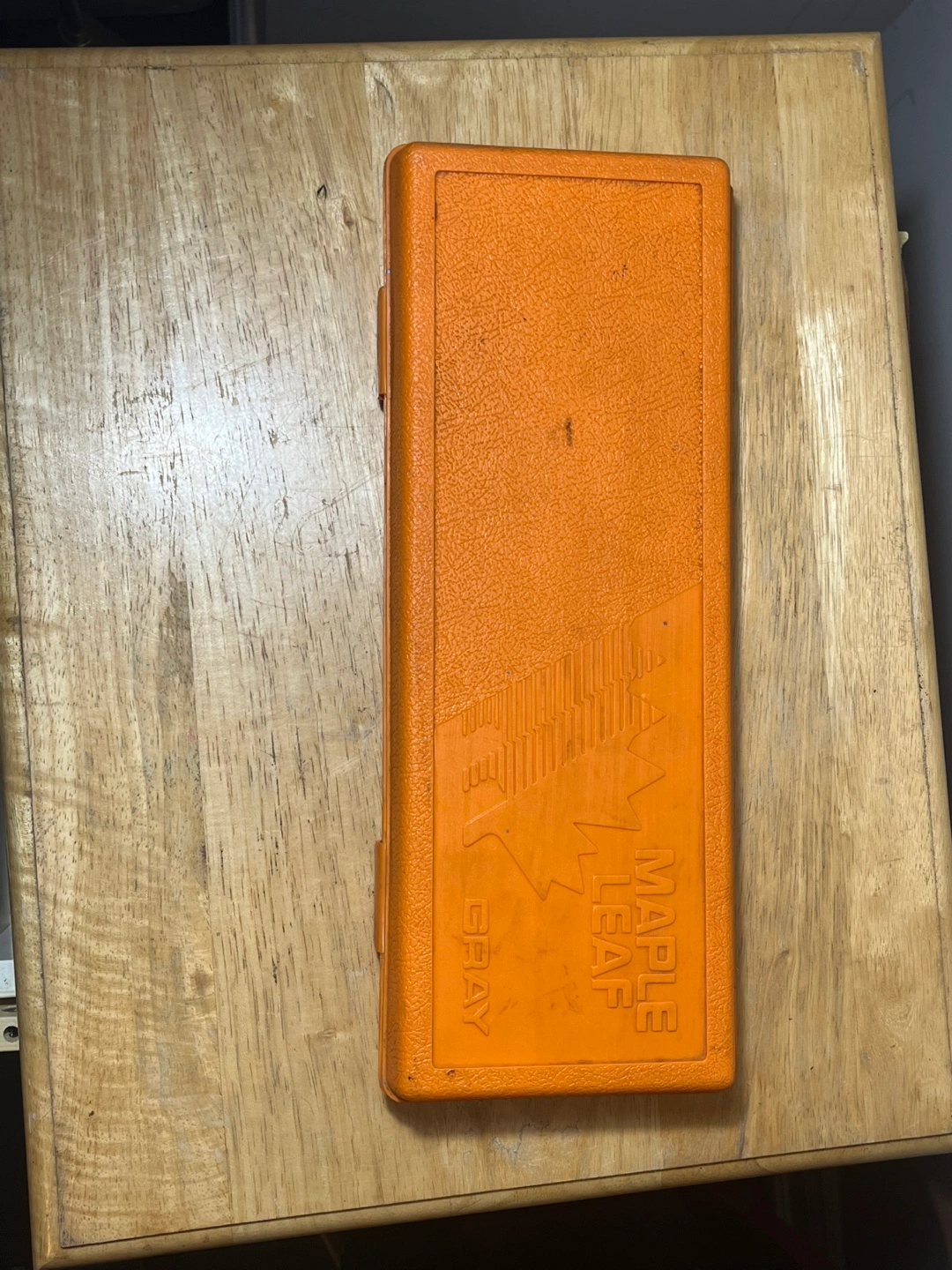 Vintage Gray Maple Leaf socket wrench set. Includes various sized sockets and a ratchet. Orange plastic carrying case. Great for mechanics or DIY projects.