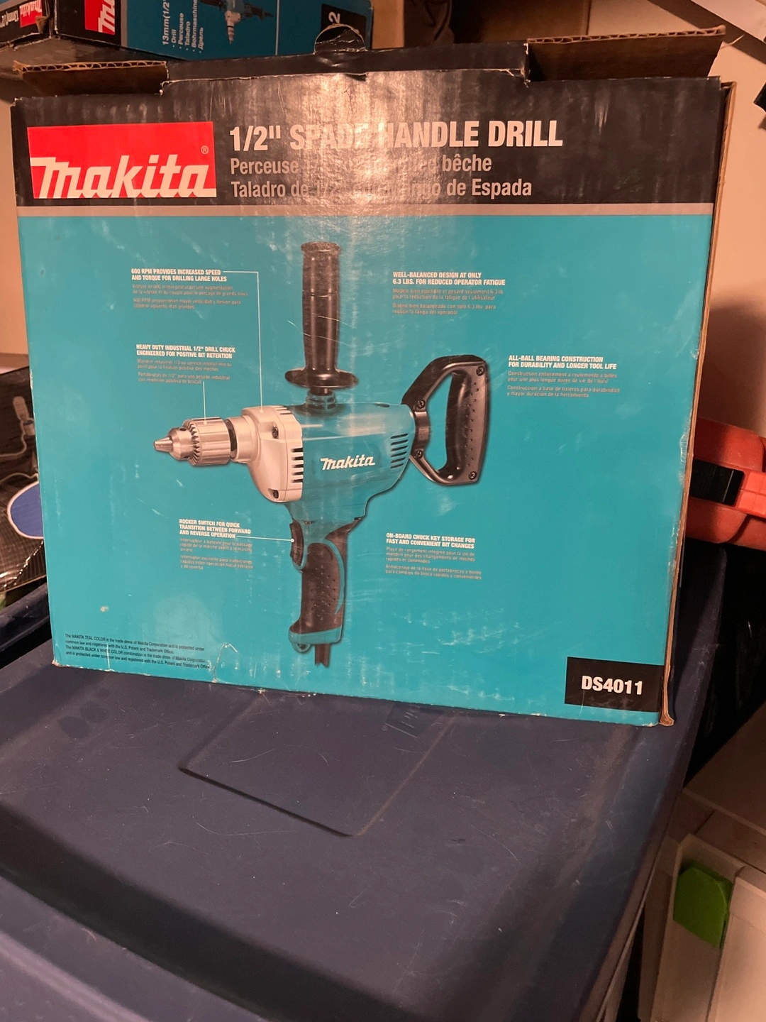 New Makita DS4011 1/2" spade handle drill. 600 RPM, well-balanced design, all-ball bearing construction. Heavy-duty chuck for positive bit retention. Includes on-board chuck key storage.