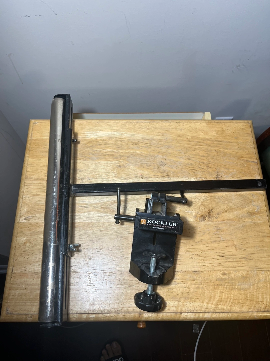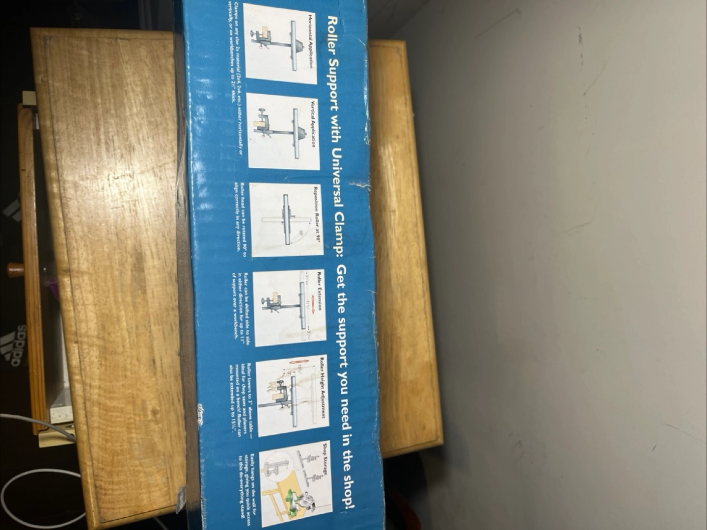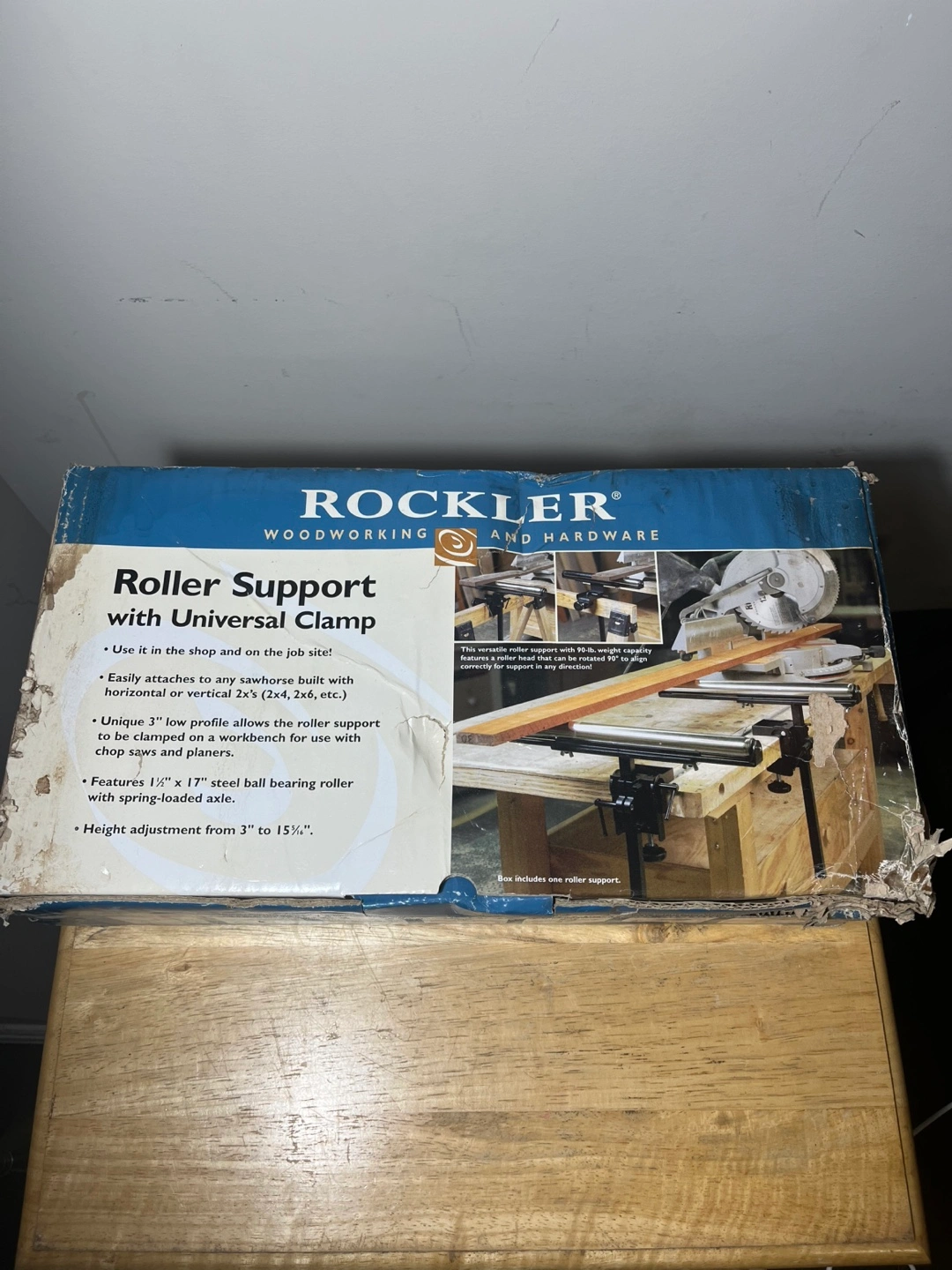Roller support with universal clamp. Attaches to any sawhorse. Unique low profile allows for use with chop saws and planers. Height adjustable from 3" to 15". Includes 1 5/8" x 1 7/8" steel ball bearing roller with spring-loaded axle. One new and one used. Sold together.