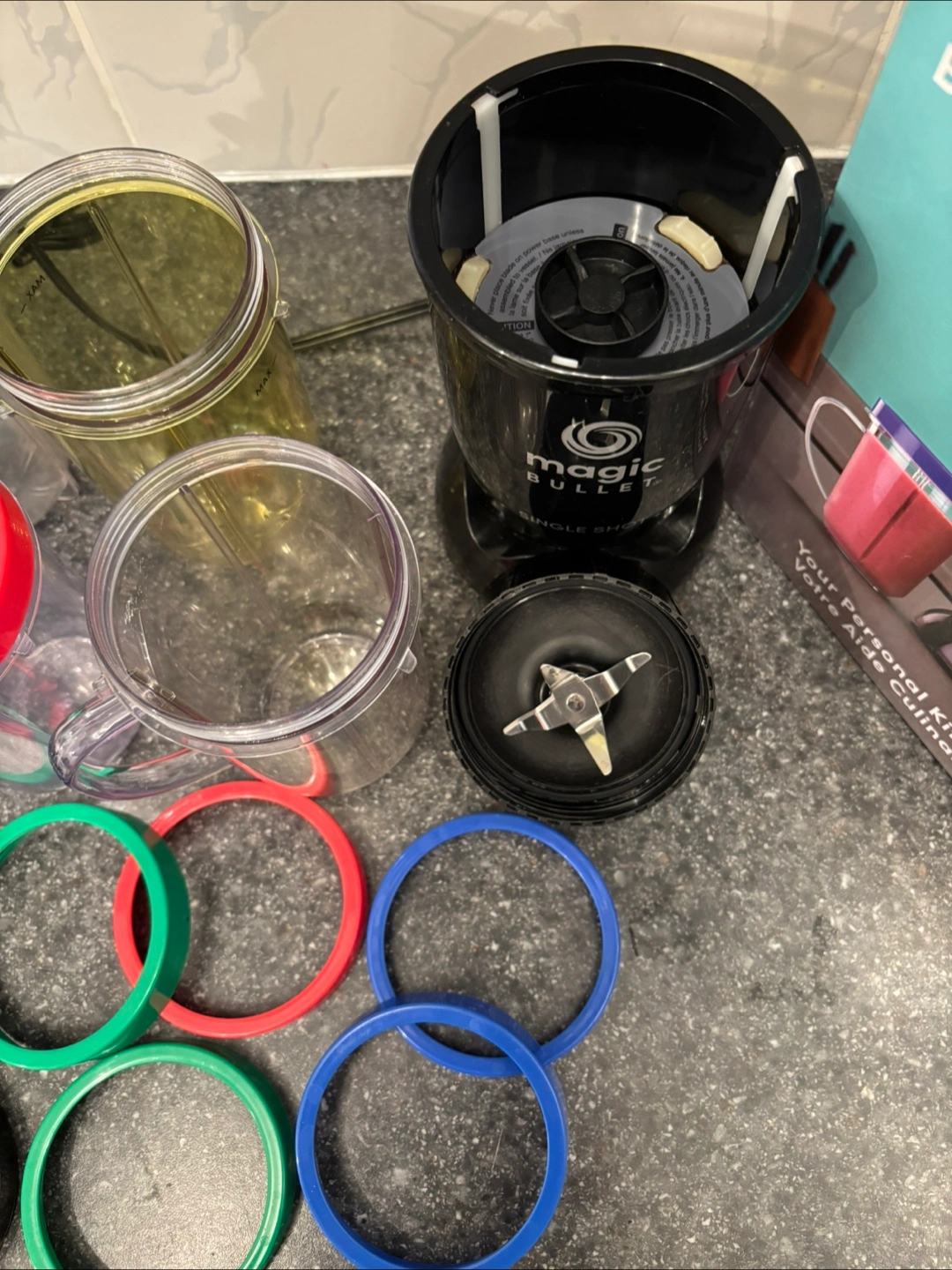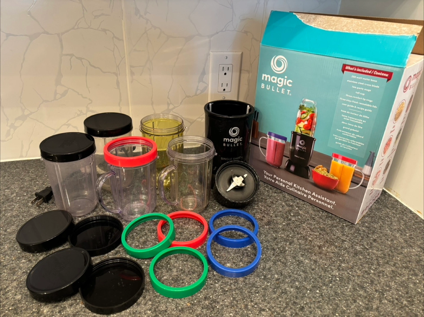 Blender with multiple cups, rings, and blades. Includes the original box and other accessories.