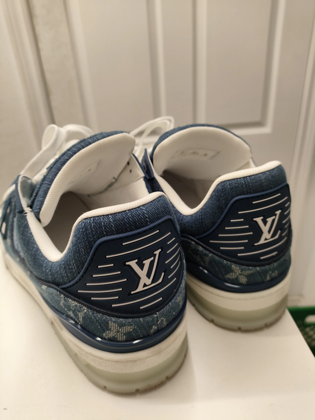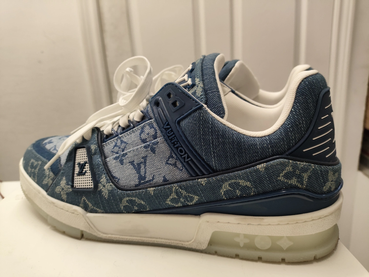 authentic Denim material on these sneakers. White soles, laces, and lining. Accents of the brand's logo. Included are storage bags. These shoes are perfect for taking long walks in the park.