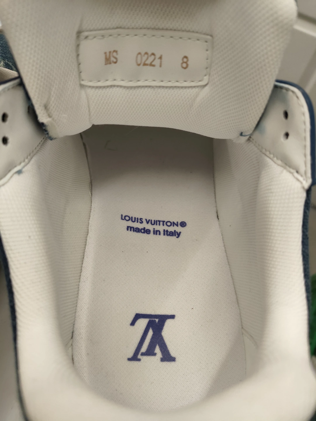 authentic Denim material on these sneakers. White soles, laces, and lining. Accents of the brand's logo. Included are storage bags. These shoes are perfect for taking long walks in the park.