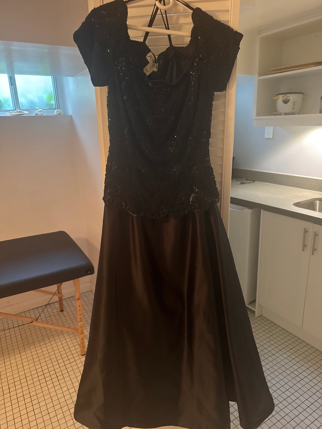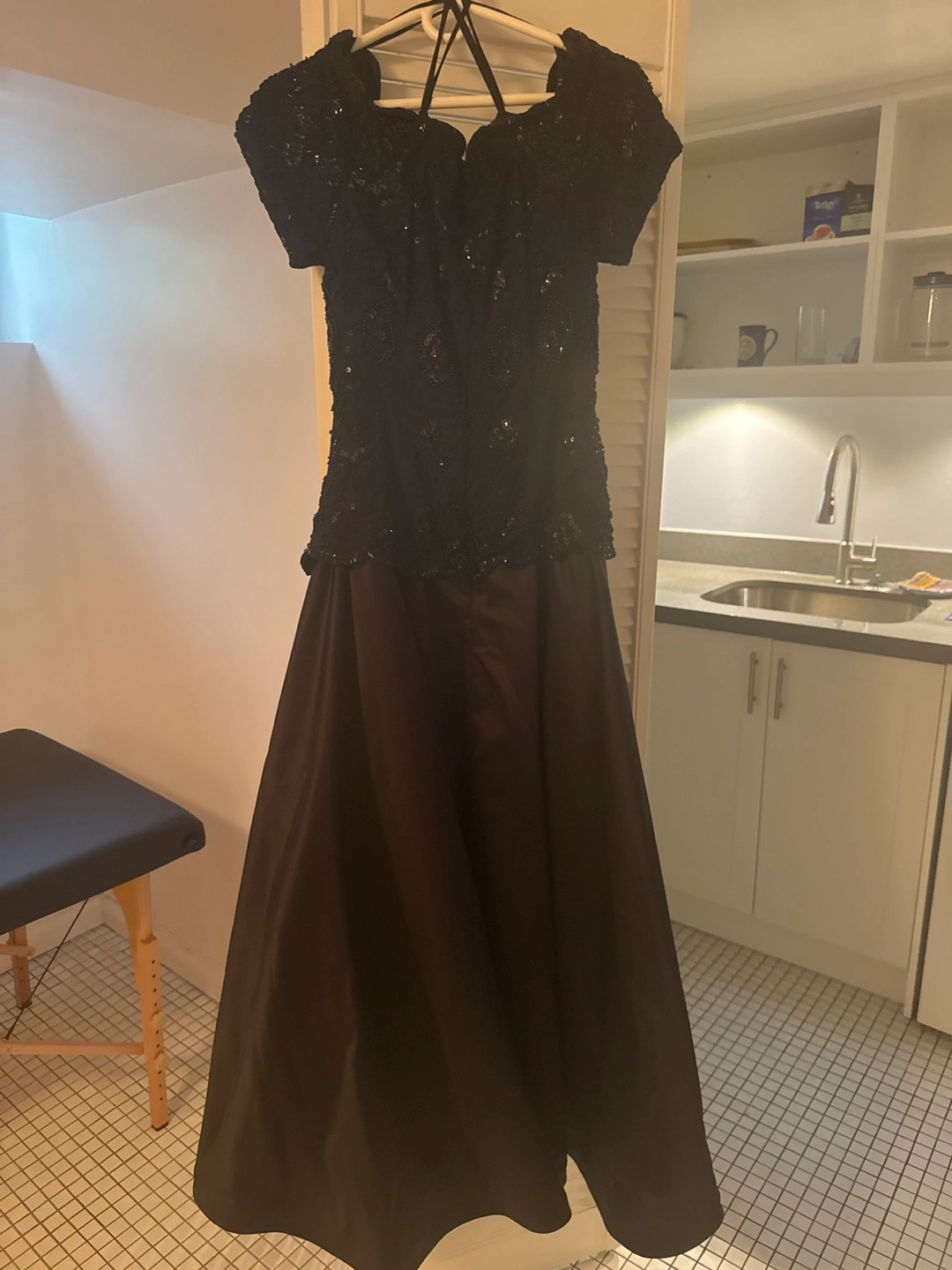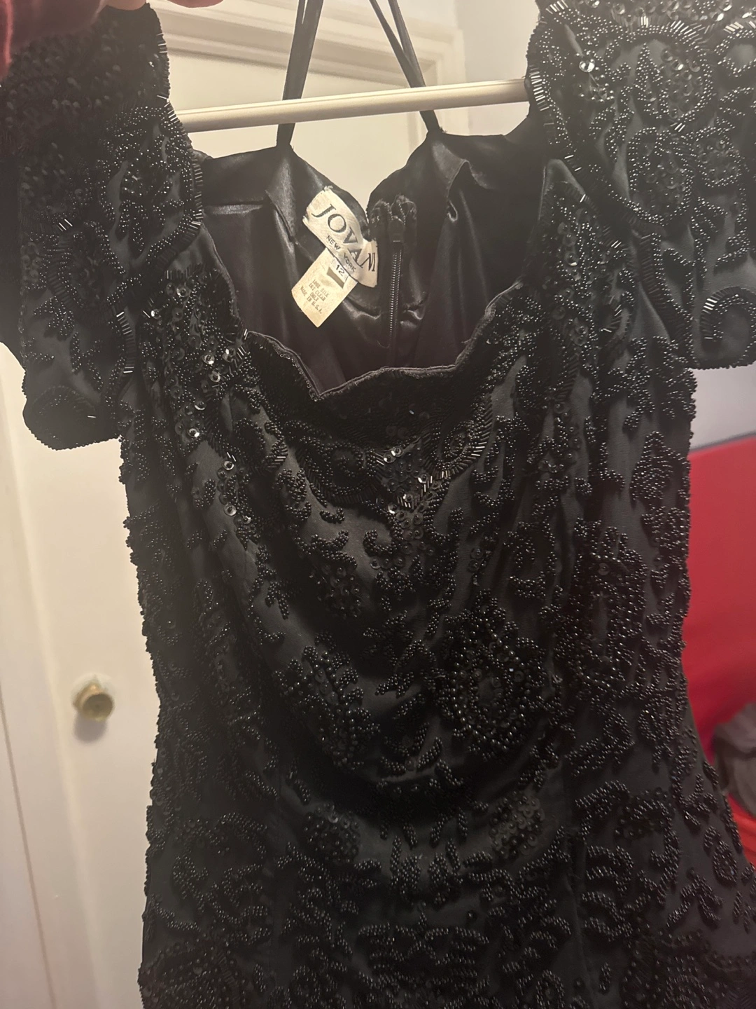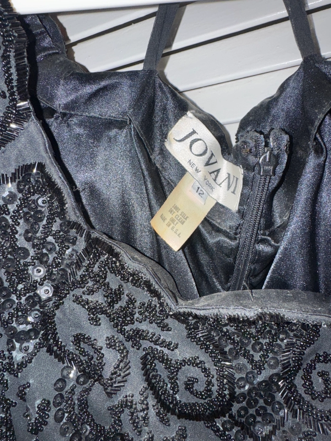 Black evening gown. Features embellishments on the bodice. Floor length skirt. Can be the perfect addition to any formal occasion.
