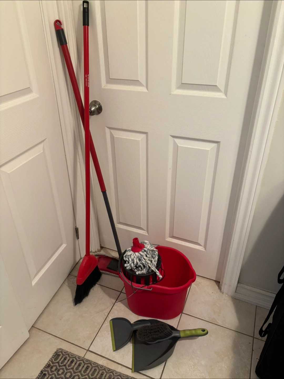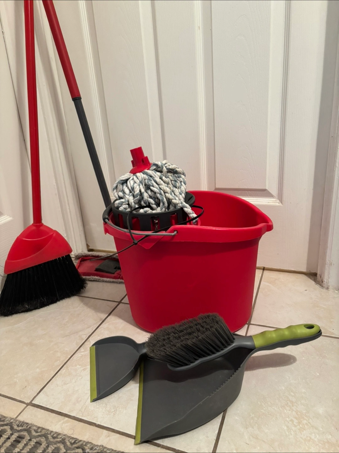 Cleaning supplies bundle. Includes a broom, mop, dustpan and bucket. Consider this the start of a clean home.
