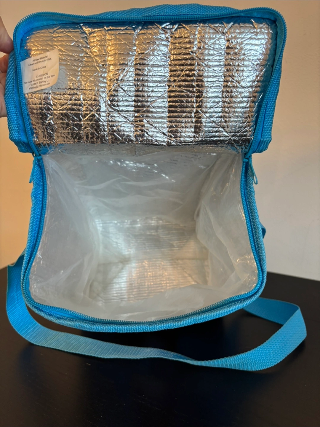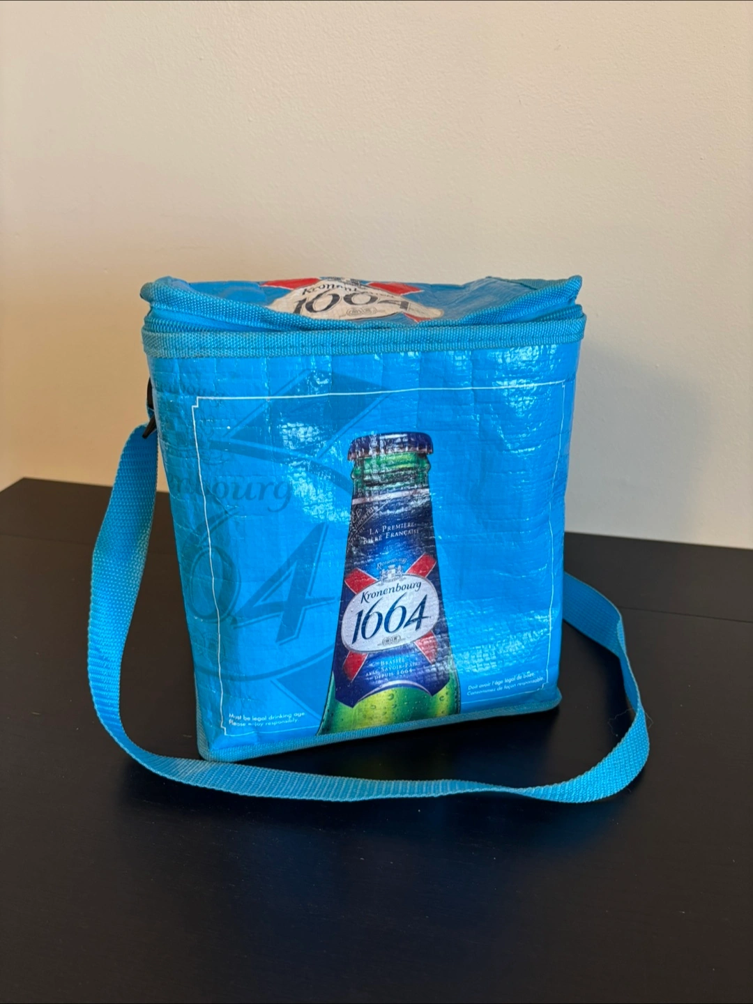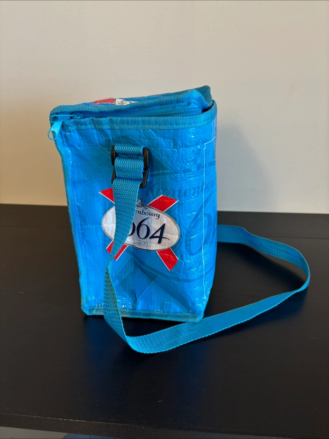 Insulated cooler bag. It has a zip closure and a carrying strap. For 6 tall cans or 8 small cans