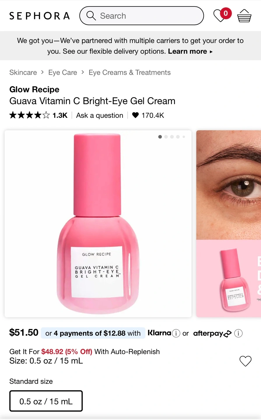 1000+Bright-eye gel cream. Comes in a pink container. Perfect for a relaxing self-care routine.