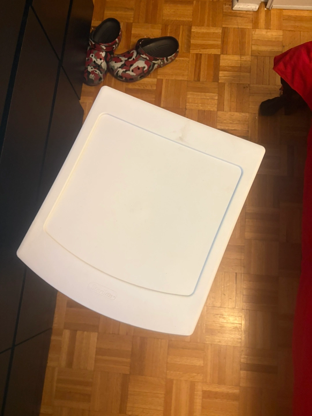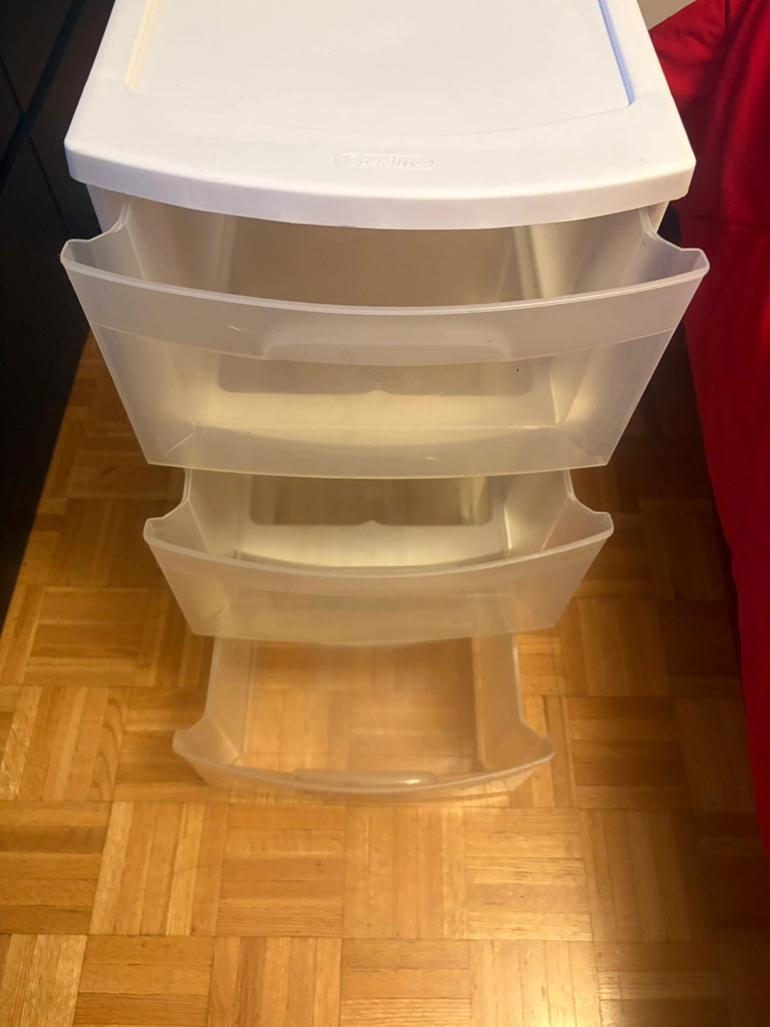 Three drawer cart. White lid and drawers. Clear plastic drawers. Perfect for storing away any extra items to keep your home organized.