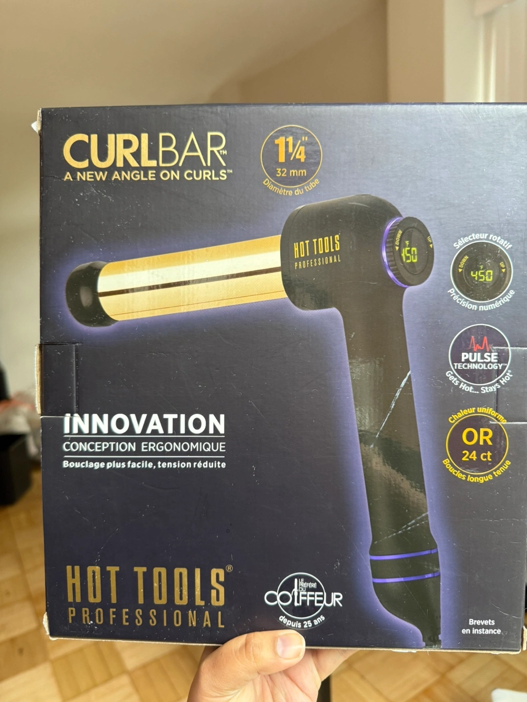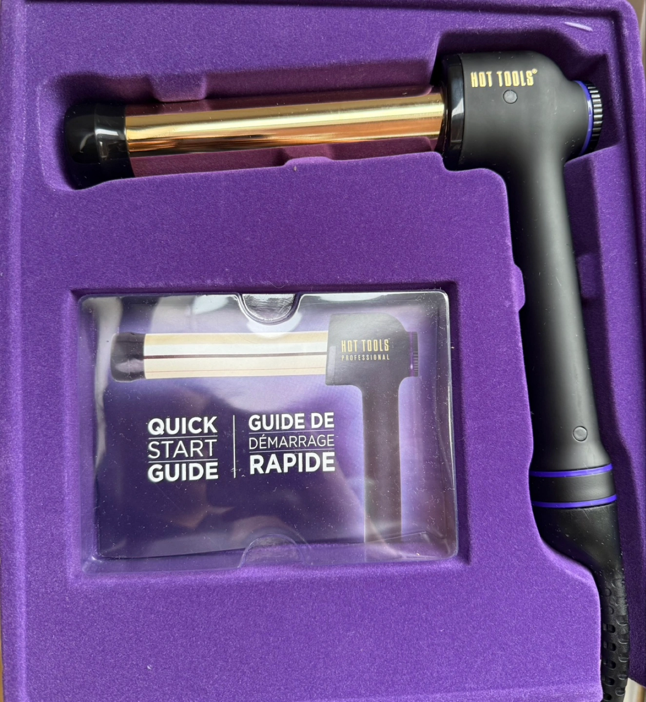 33Curling iron in original box. Comes with a quick start guide. The curling iron has a black handle with gold-coloured barrel. This would make styling your hair a breeze.