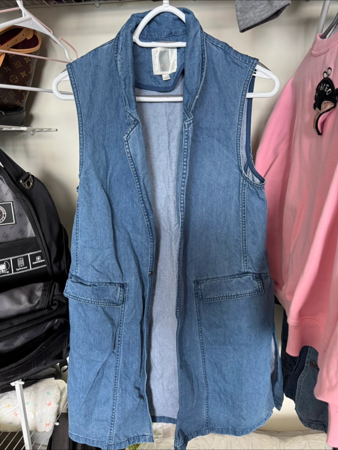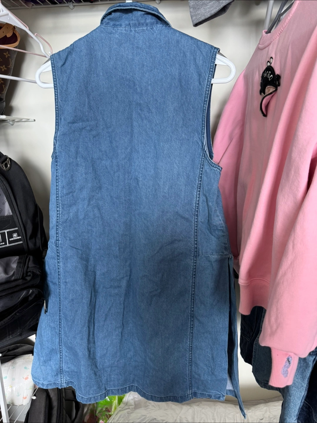 Sleeveless denim vest. Features a collared neck and two front pockets. Perfect for layering over a casual outfit for a relaxed, put-together look. Brand new never wear. m size