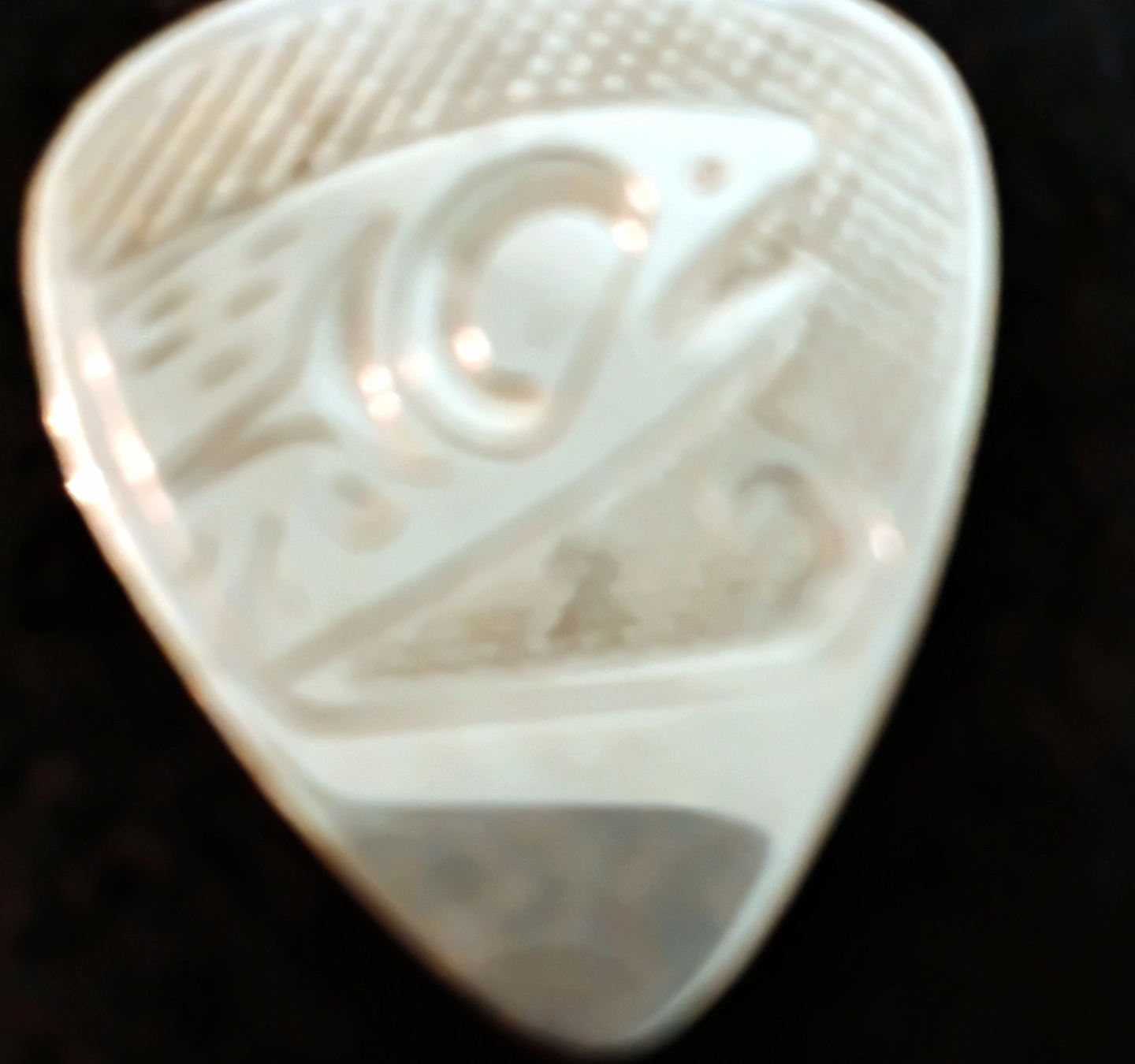 A guitar pick. Features a salmon design. Consider using this pick to enhance your guitar playing experience, and let it ease your mind.