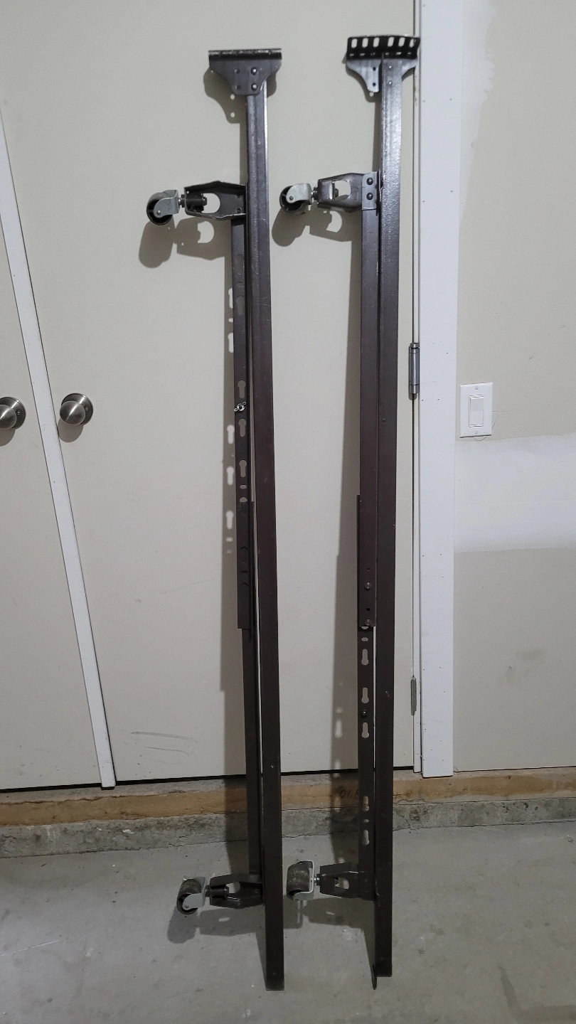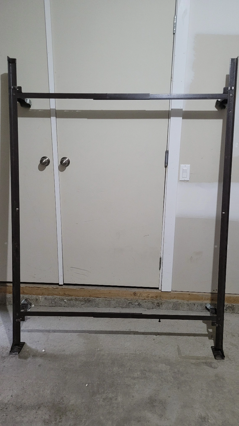 Adjustable Metal bed frame with wheels. Can be adusted to Twin, double, and queen. cons missing center bar. Used but in good condition.