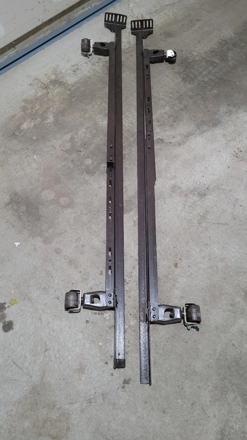 Adjustable Metal bed frame with wheels. Can be adusted to Twin, double, and queen. cons missing center bar. Used but in good condition.