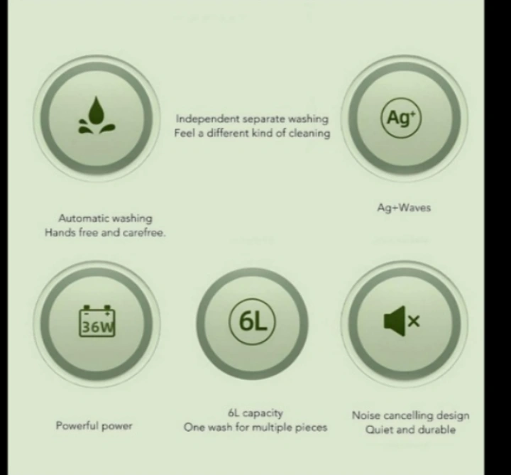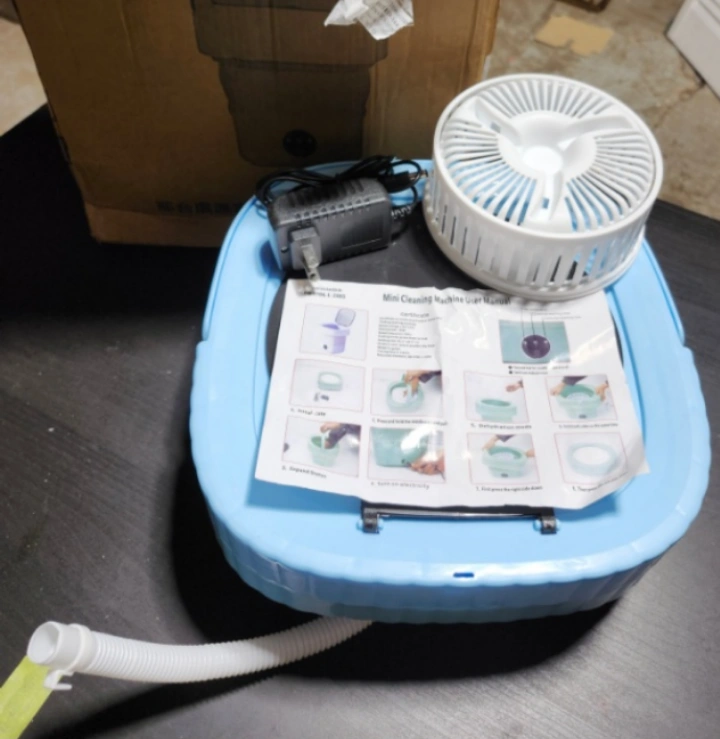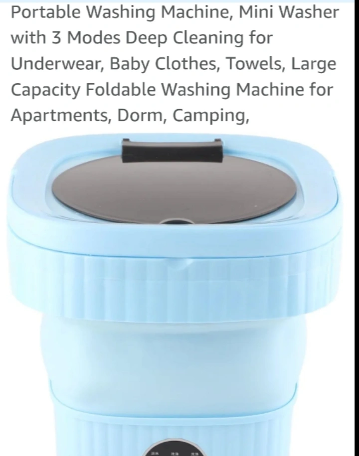 A portable mini washing machine, perfect for small loads. Designed to easily and conveniently wash your clothes. It is a great addition to any household. The washing machine is shown in blue with a black lid. It features a handle on the top.